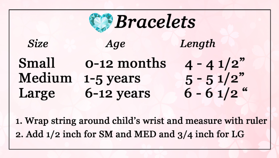 Available in five sizes. SM 0-12 months, MED 1-5 years, LG 6-12 years, Adult SM - 7", Adult LG 7.5"