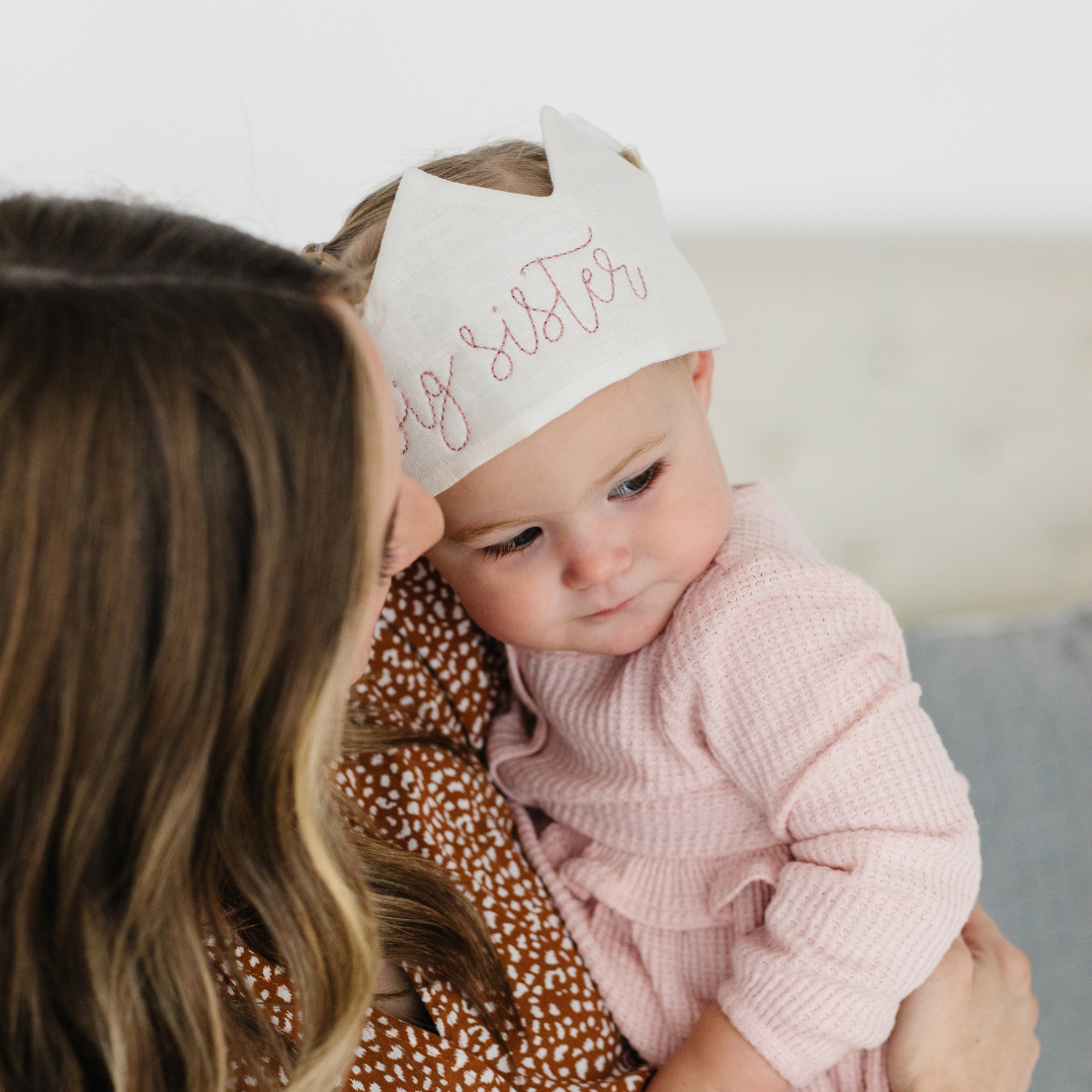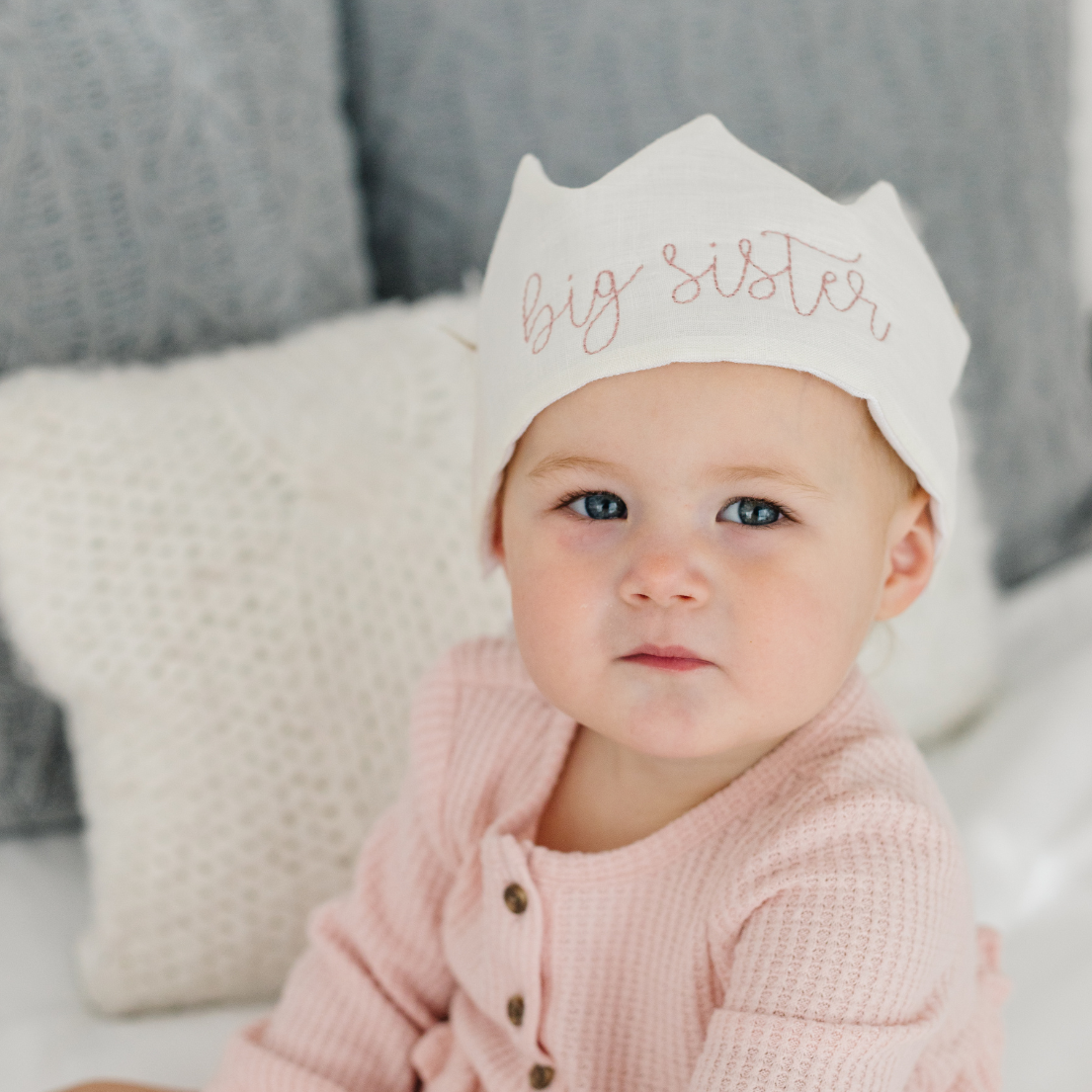 This precious crown is made with fine embroidery on 100% linen for that special touch as it adjust softly around any her head. Its one-of-a-kind design includes "big sister" embroidered in rose thread with care, making it the perfect gift from baby to forever remind your little one just how important they are in the family dynamic.