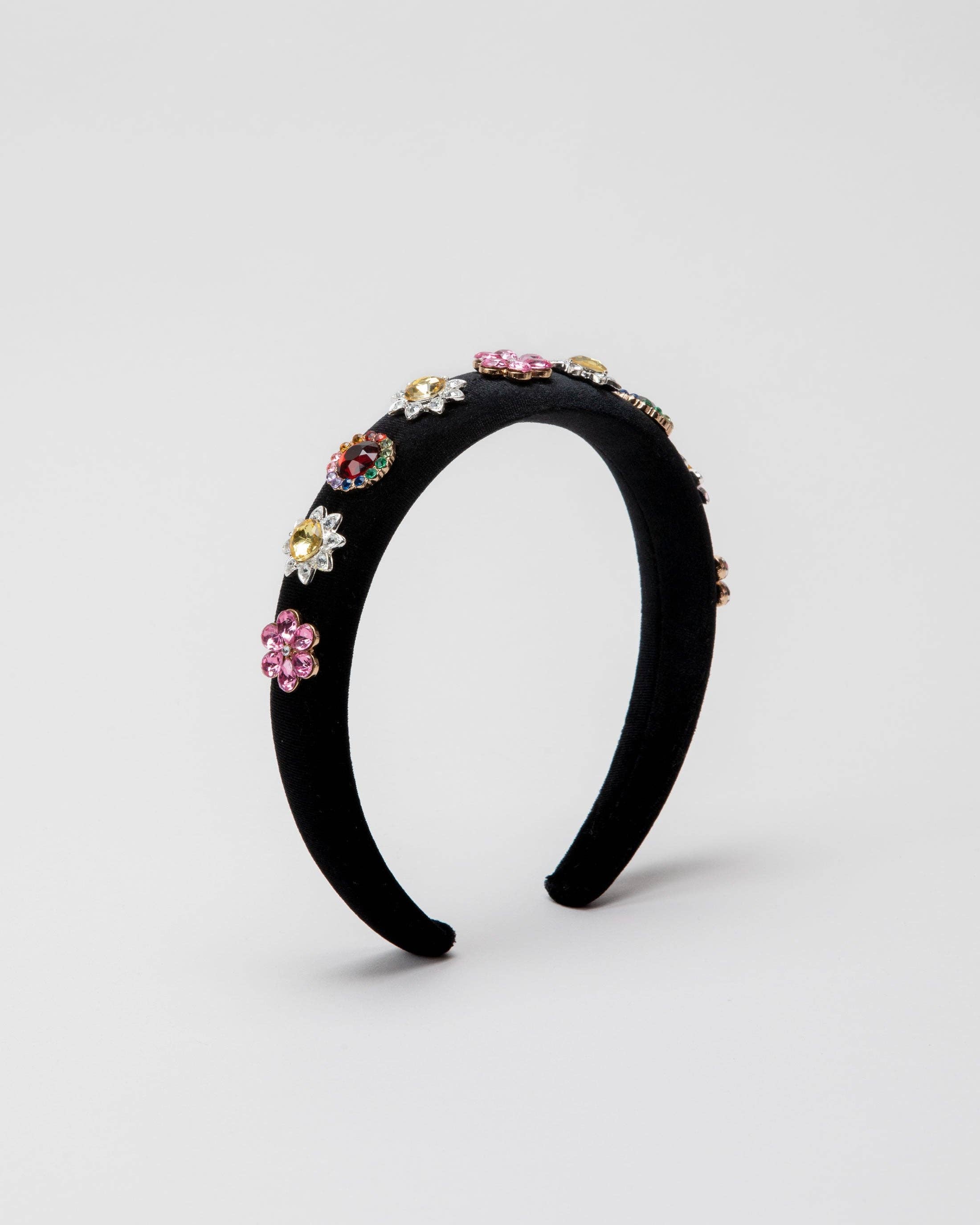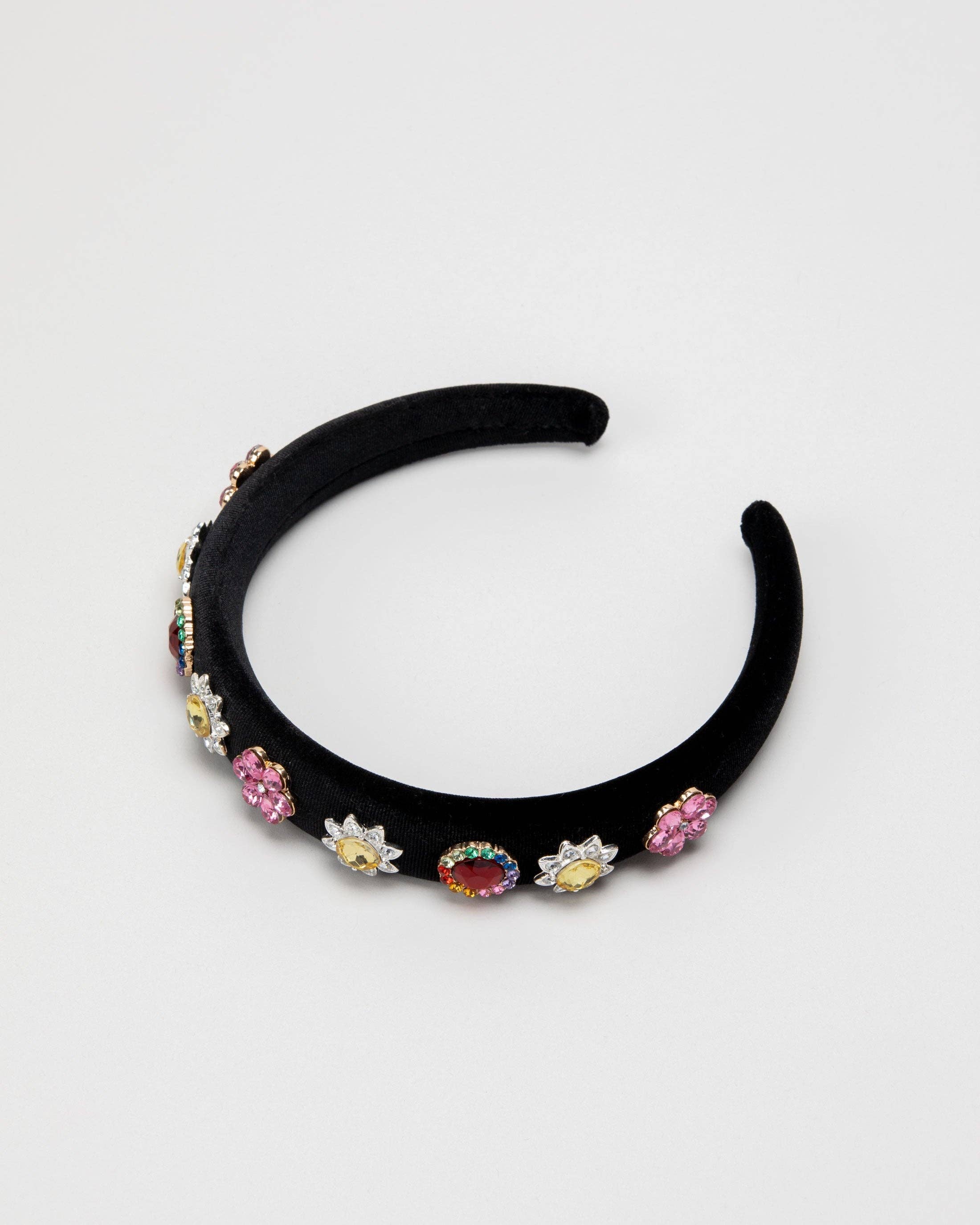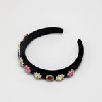 Snag your front row seat (or front yard porch chair!) and smile in style! This extra padded, black velvet headband is as comfy as it is stylish. Oversized floral gemstones in vibrant colors give a high-fashion pop to any outfit. Perfect for people-watching, trend-spotting, and catching the eye of allll the street-style photogs.