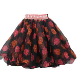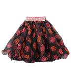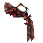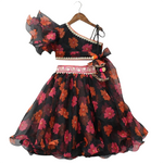 This is the Black & Pink Floral printed ready to wear Lehenga choli with one shoulder blouse, flutter sleeve, and zip closure. Matching skirt has drawstring closure with a flared hem.