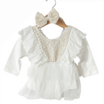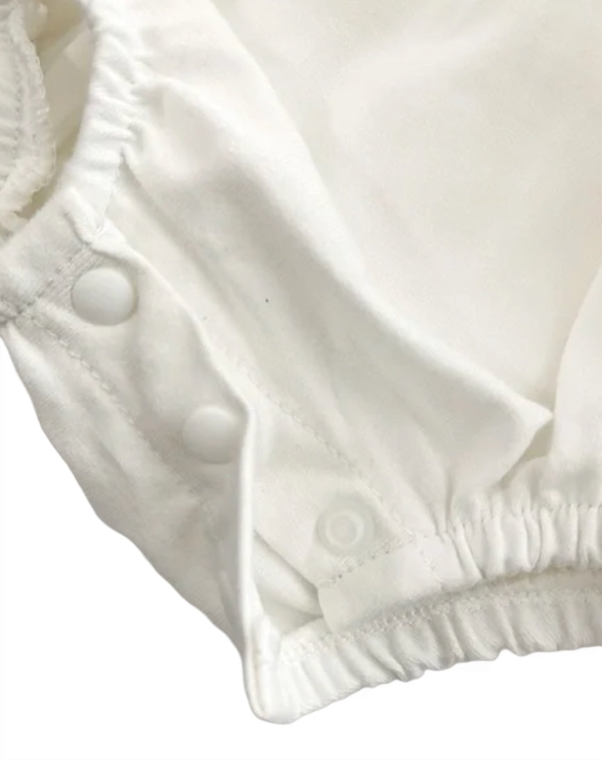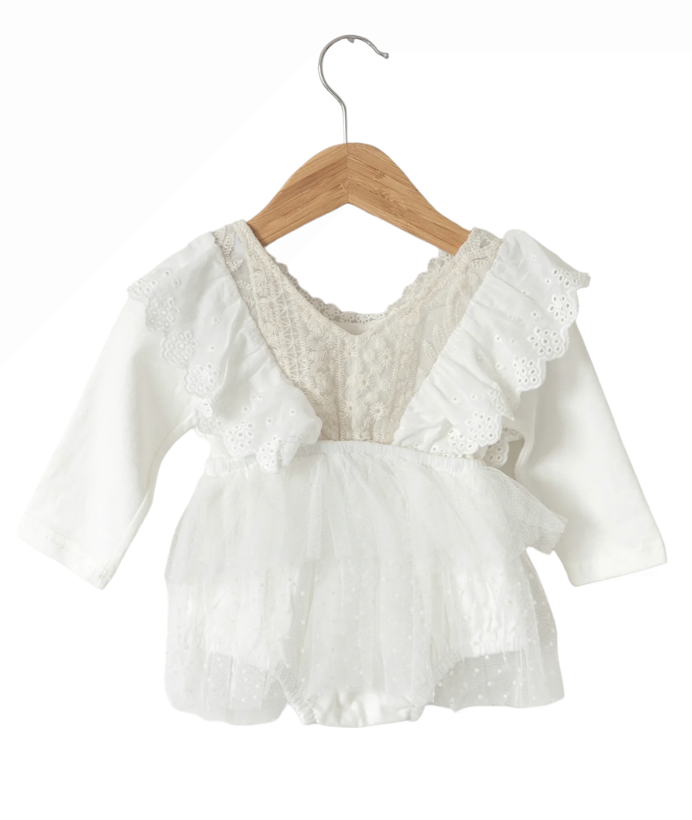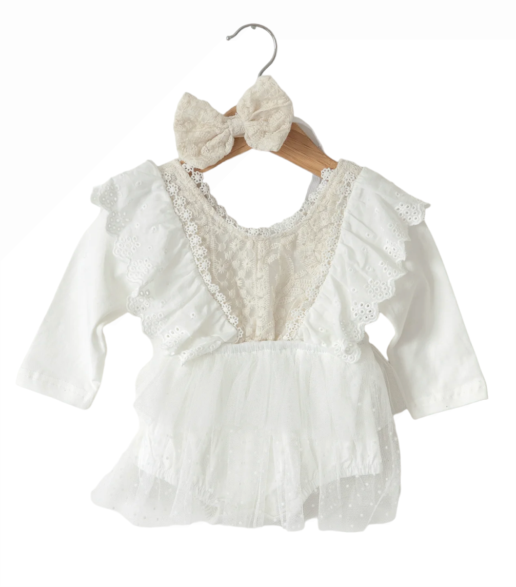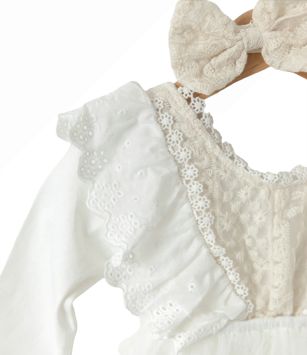 Prepare your little one for a day of enchantment with our Girls White Embroidery Charlotte Onesie. Delicate lace and stitching details adorn this piece, adding a touch of elegance to her ensemble. Subtle polka-dot tulle adds whimsy and charm, while elastic around the legs and waist ensures a comfortable fit. Snap buttons at the bottom allow for easy changing, making this onesie both practical and adorable. Complete the look with the matching bow headband, perfect for adding a final flourish of sweetness to her outfit