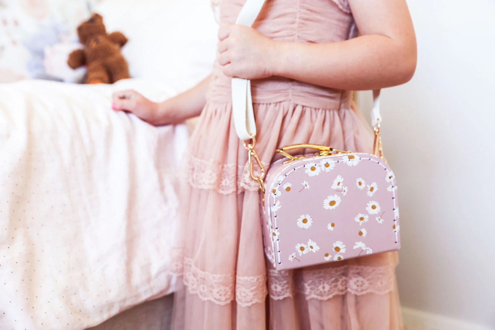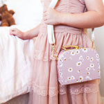 he Alimrose Coco Cross Body Case in Daisy Days is a charming and practical accessory for little ones. Featuring a delightful daisy pattern on a soft pink pastel background, this crossbody case is perfect for carrying small treasures. With its adjustable strap and secure snap closure, it offers both style and functionality, making it a lovely addition to any outfit.