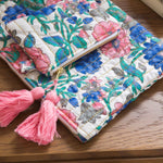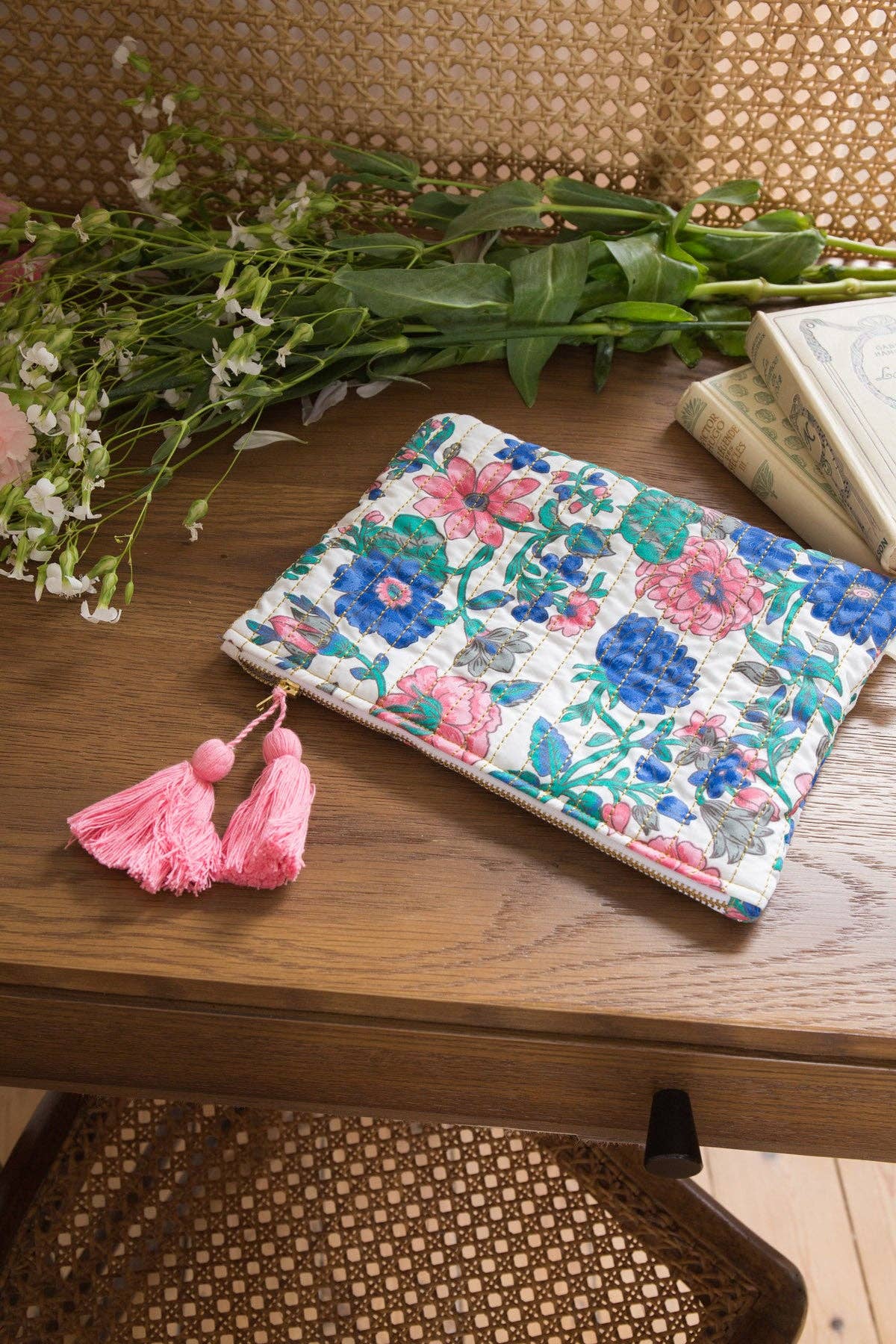Practical and bohemian accessory, this quilted and tasseled pouch is essential for everyday use. You can slip your small belongings into it, use it as a large wallet, in short, it never leaves your side. To give or to treat yourself!