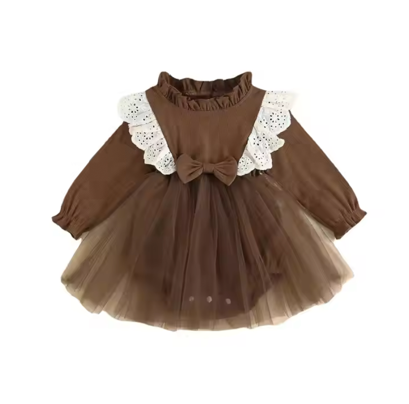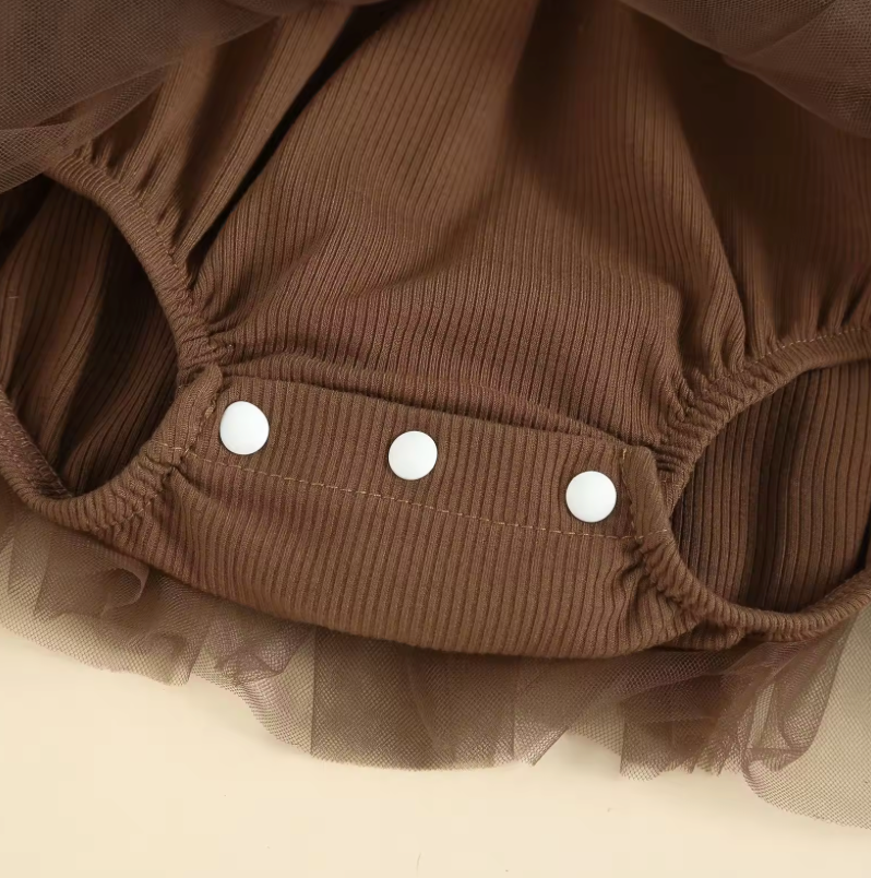 The cutest Sedona dress is here! made of a soft ribbed cotton in a pretty chocolate brown color. It has lace flutter details along front and back princess seam. front bow design with ruffled neckline and sleeve opening. Also has a back keyhole closure for the added cuteness! With an attached tulle skirt all around. Pair this with bows and knee high socks to complete this whole outfit!