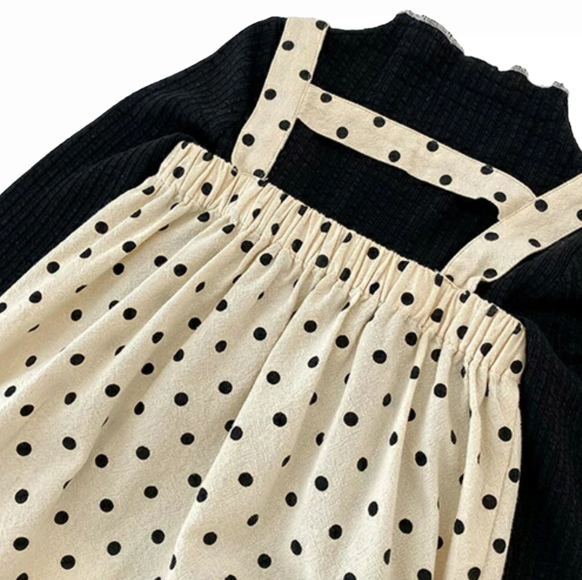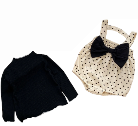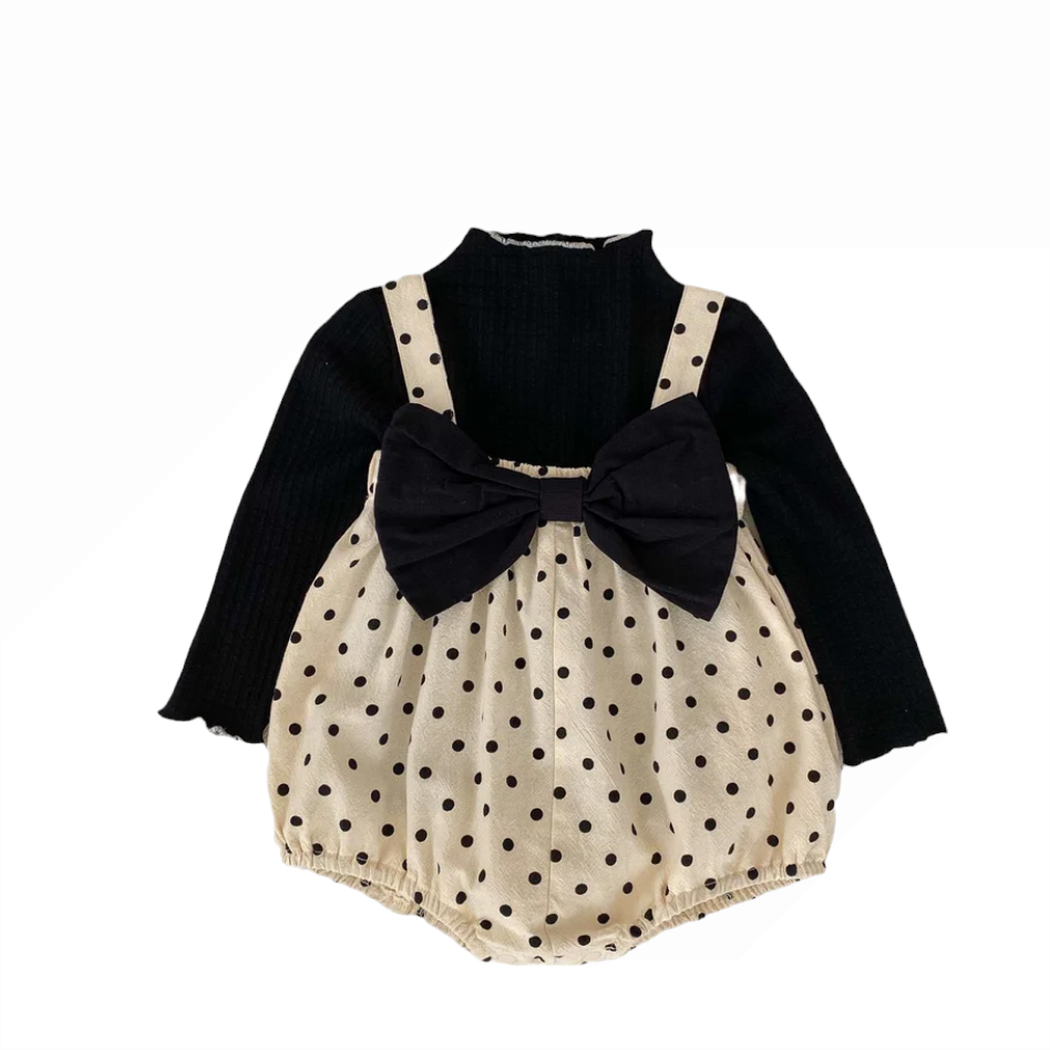 Step into sophistication with our Elegant Noir Bow Romper complete with a matching long sleeve top. Adorned with chic black polka dots and featuring a gracefully large black bow, this romper exudes timeless charm and effortless style. Perfect for any occasion, it's a must-have addition to your little one's wardrobe, promising both comfort and elegance.