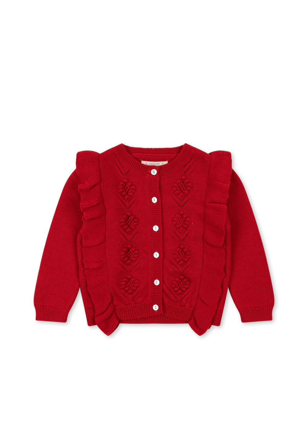 Soft and warm cardigan with intricate knitting patterns and frill details. Closes with mother of pearl buttons in front.