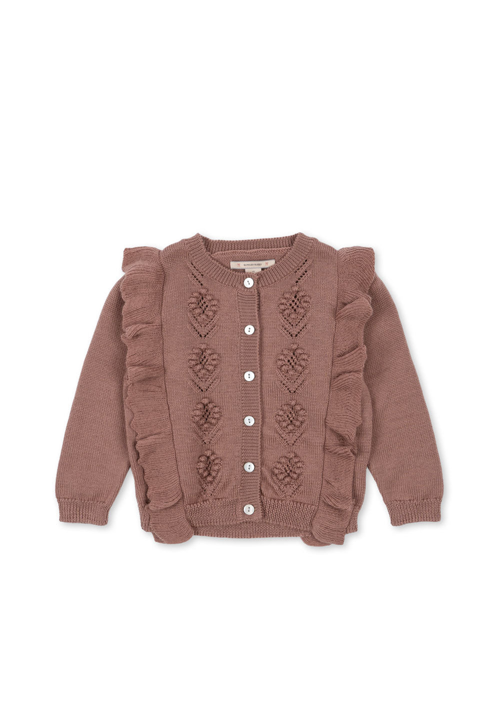 Soft and warm cardigan with intricate knitting patterns and frill details. Closes with mother of pearl buttons in front.