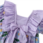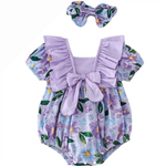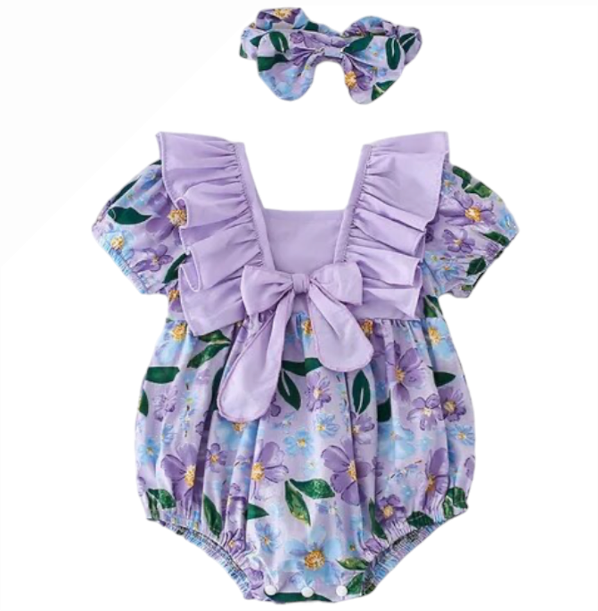"Wrapped in petals, crowned in charm: in my purple floral romper, I bloom with grace, topped with a bow like a flower in its prime."