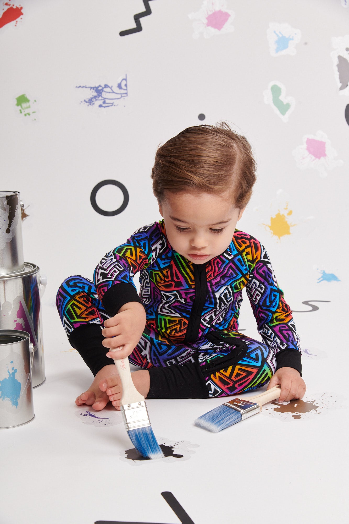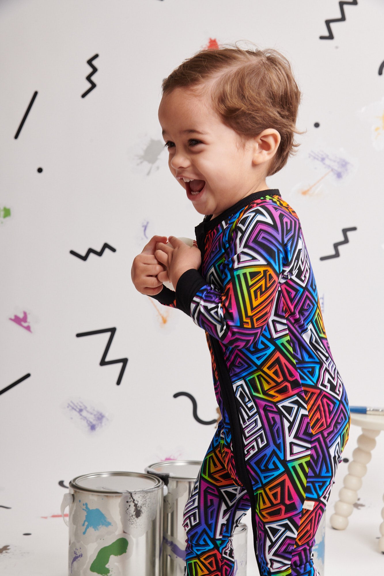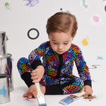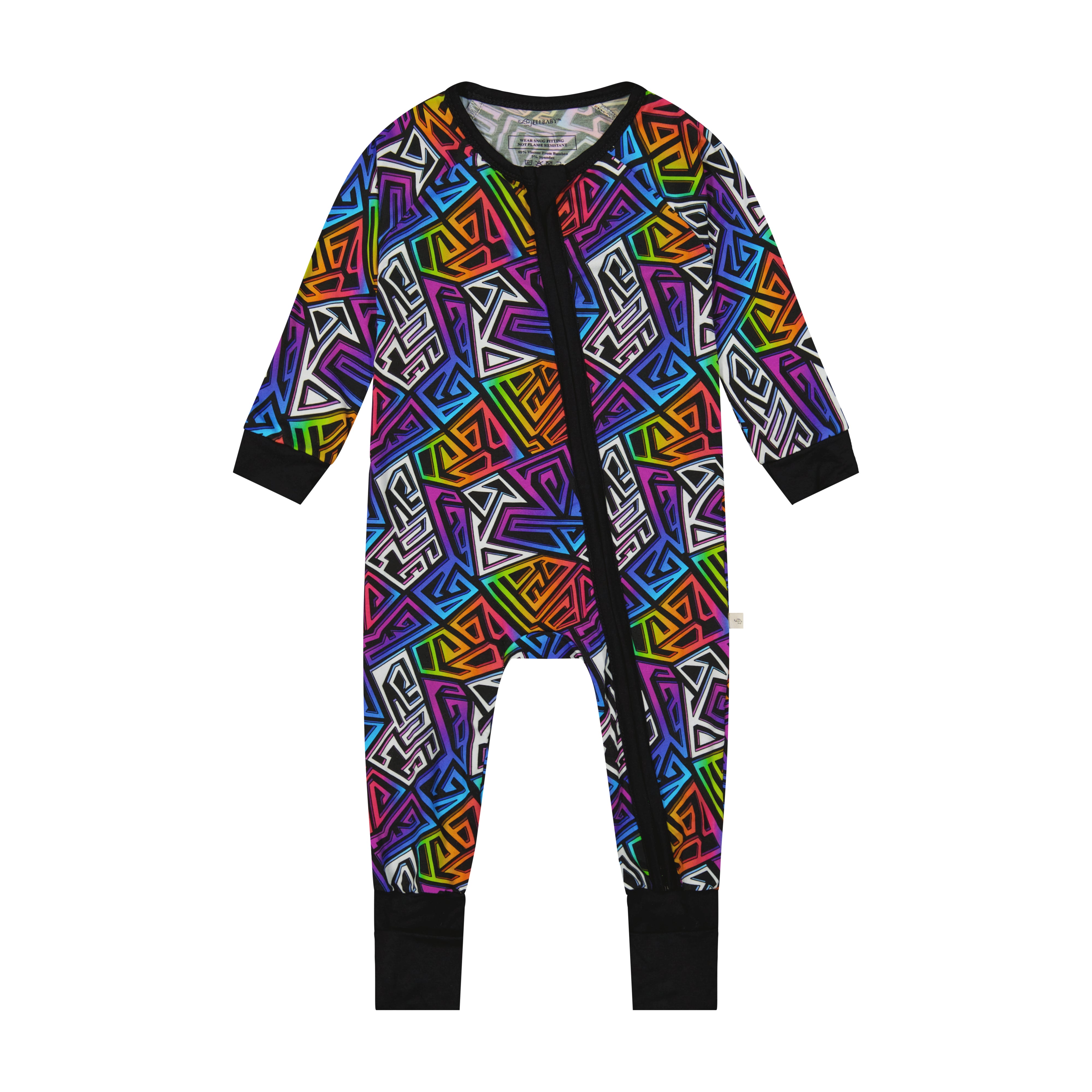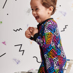 Pajamas that do it all? Yes, please! Our Graffiti Groove convertible zipper pajama, crafted from Ānanda Bambu fabric, combines vibrant style with ultimate practicality. The abstract geometric print on bamboo pops against black, while the buttery-soft fabric and zip-to-foot-or-waist magic make this a must-have for on-the-move little ones.