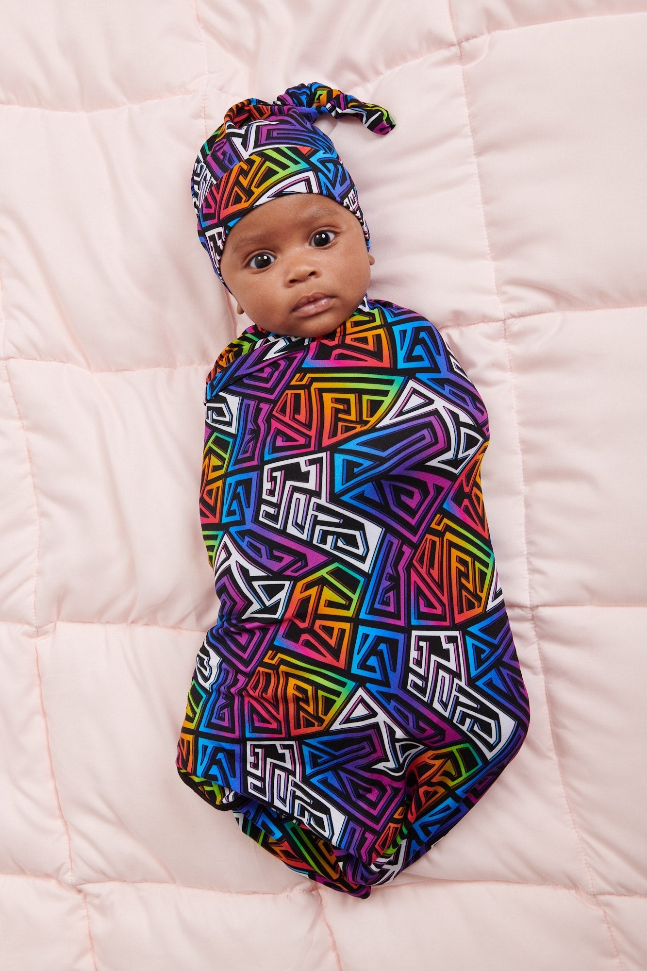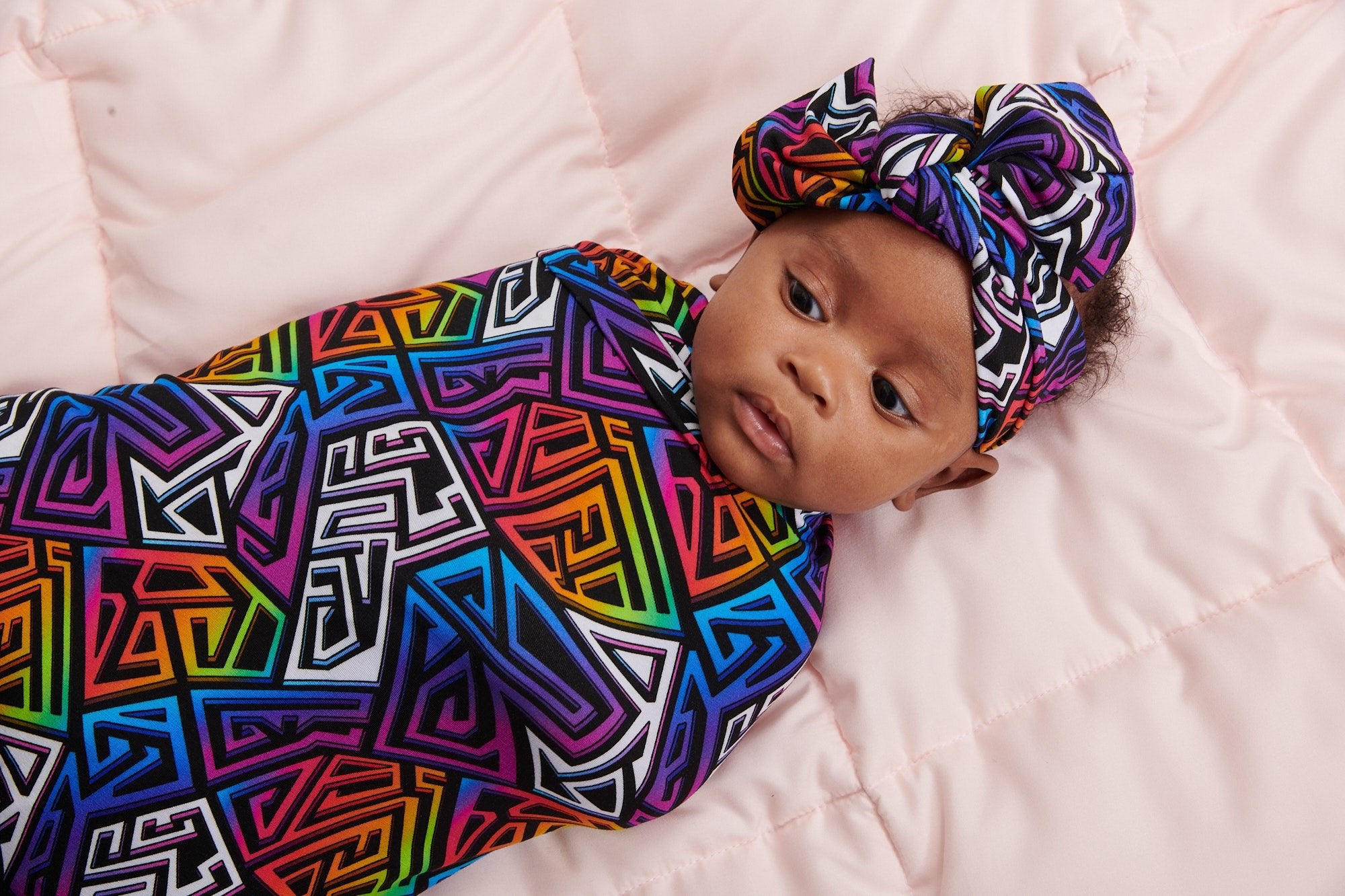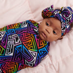 Get ready to swaddle in style with our Graffiti Groove blanket, made from our luxuriously soft Ānanda Bambu fabric. This colorful abstract geometric pattern on a dramatic black background is as bold as your little one’s personality. Lightweight, breathable, and buttery smooth bamboo material—snuggle time just leveled up! Want to be more stylish? Add the matching headband or cap.