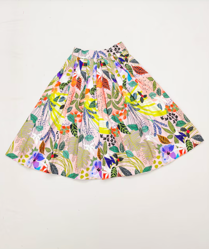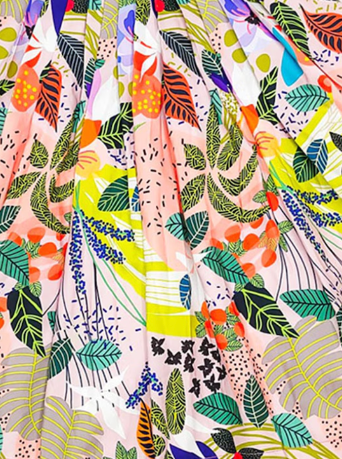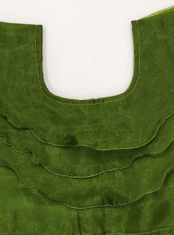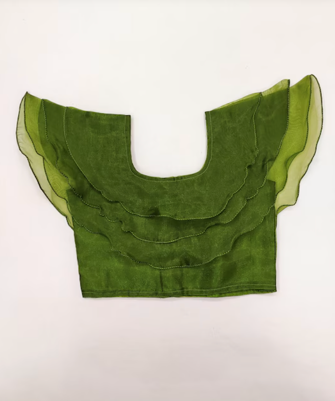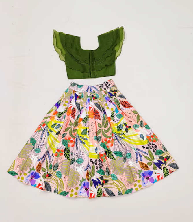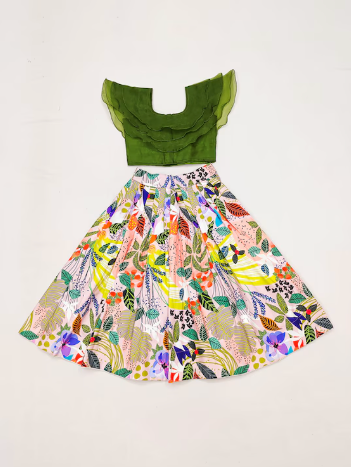 This is our Green Tropical Floral Print lehenga choli with unique tie and dye hand-technique and ready to wear sleeveless blouse.