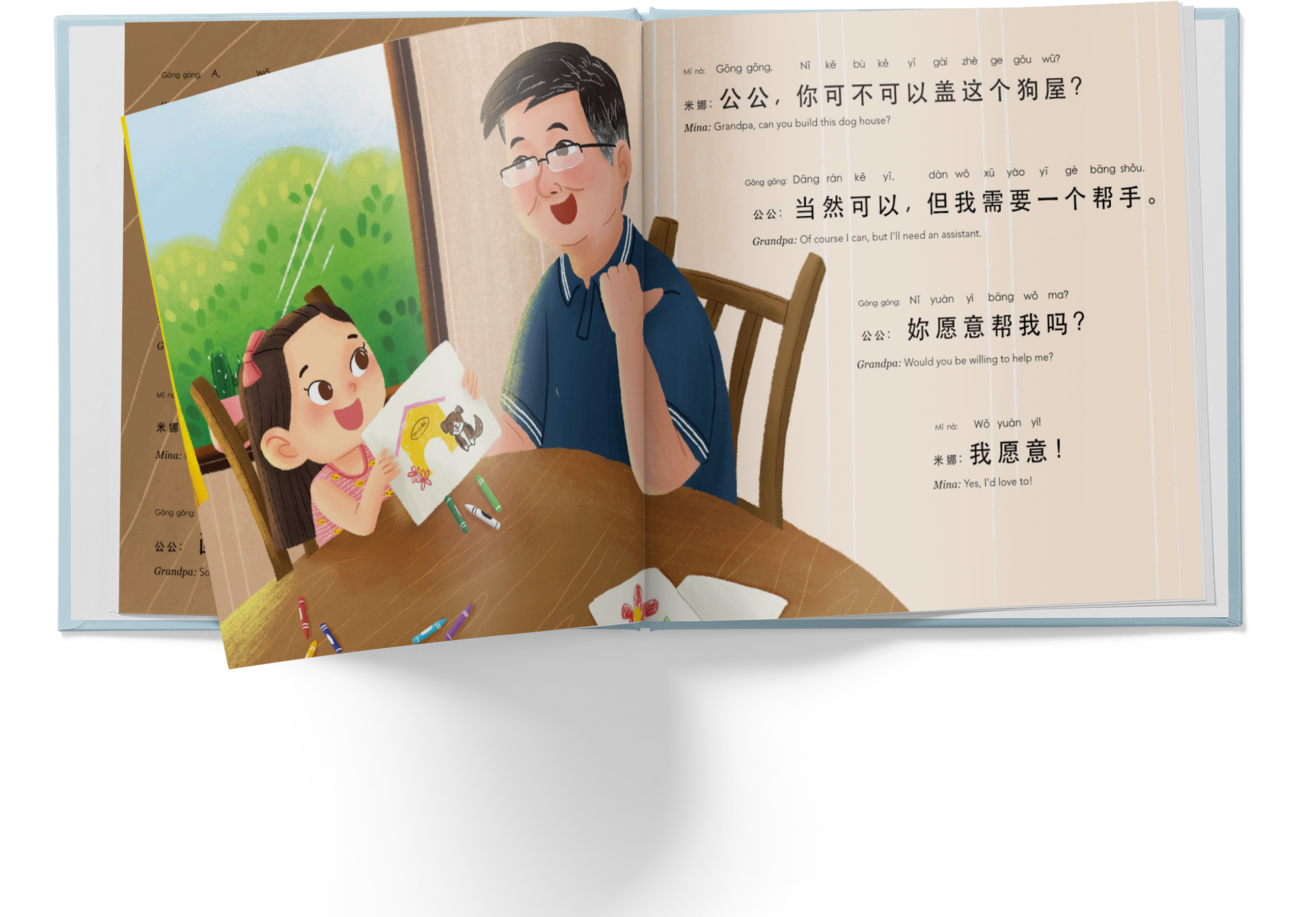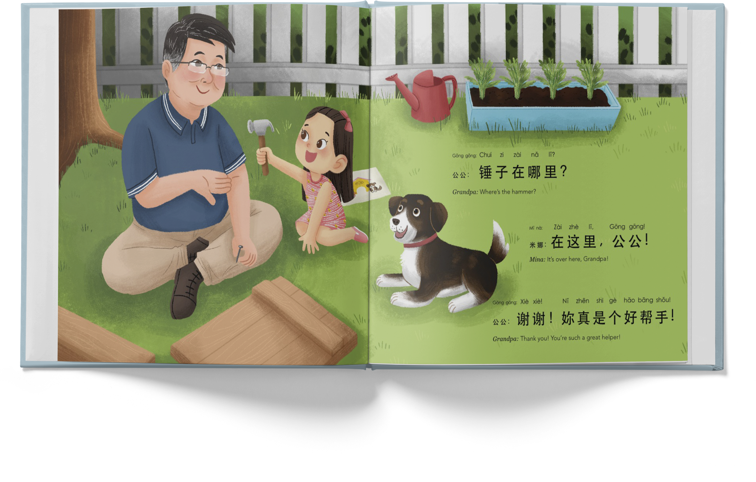 Mina has a brilliant idea for her puppy, but she can’t do it alone! She spends a fun-filled day with her grandpa, creating, building and developing their special bond. Join Mina and Gong Gong (grandpa) as they team up to bring her idea to life! This book showcases everyday dialog to support your child in Chinese learning.