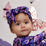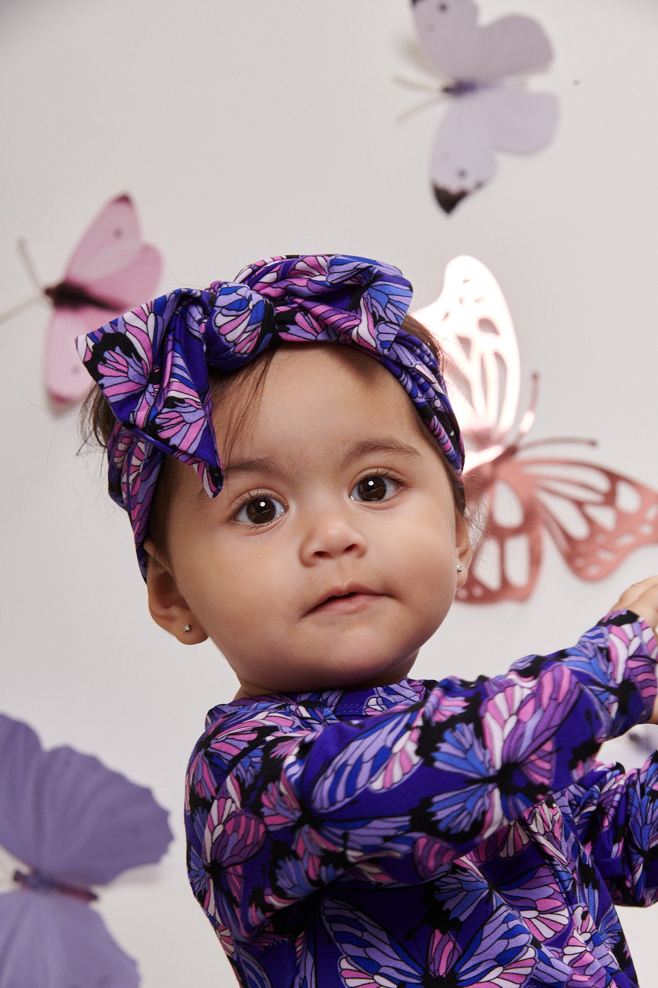 Elevate any outfit with the spellbinding charm of the Iridescent Indigo headband made of bamboo. Featuring delicate purple butterflies on a moody indigo canvas, this Ānanda Bambu accessory is a touch of magic that’s as gentle on your baby as a butterfly’s wing.