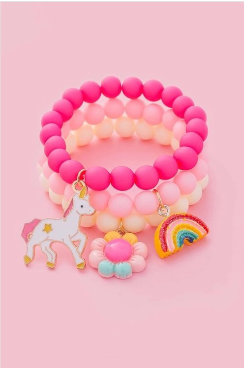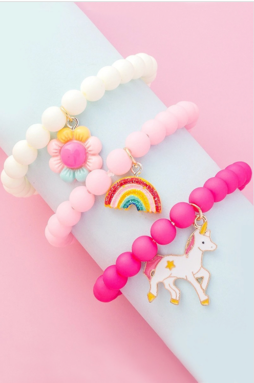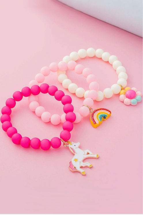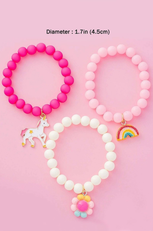 Crafted with durable rubber beads, these bracelets are not only vibrant and eye-catching but also comfortable to wear. The set includes three distinct charms – a magical unicorn, a blooming flower, and a radiant rainbow – offering a touch of imagination and color to your child's outfit.
