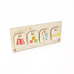 MATERIALS: Box, wooden stand, wooden dowels, 14 task/star tokens, 6 watercolour pencils, paintbrush, pencil sharpener