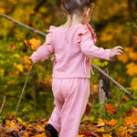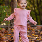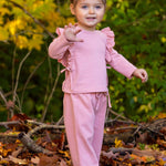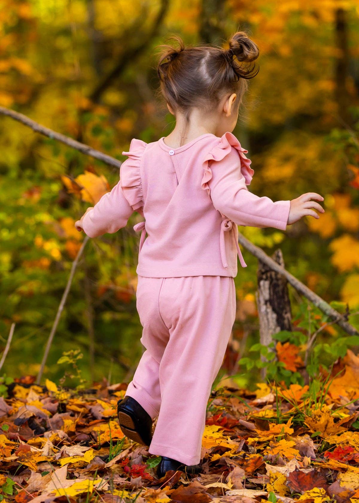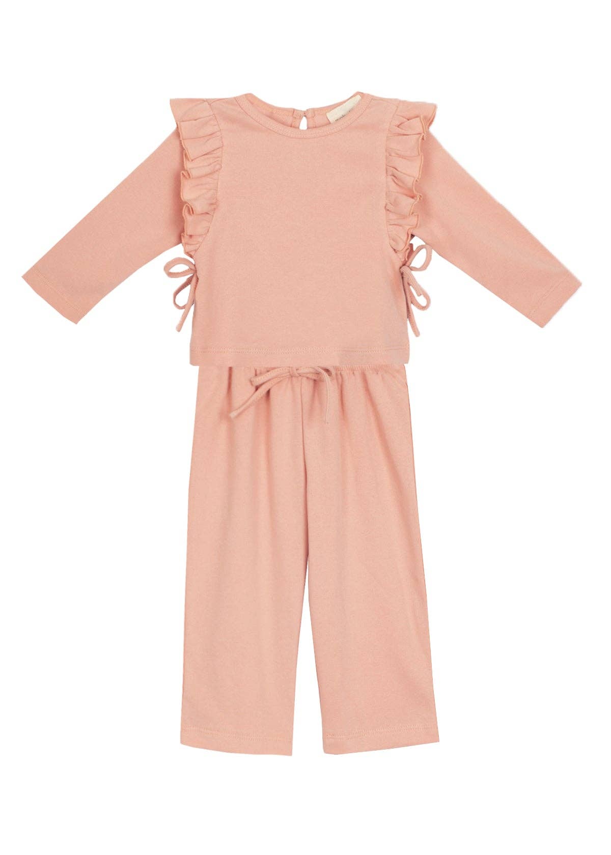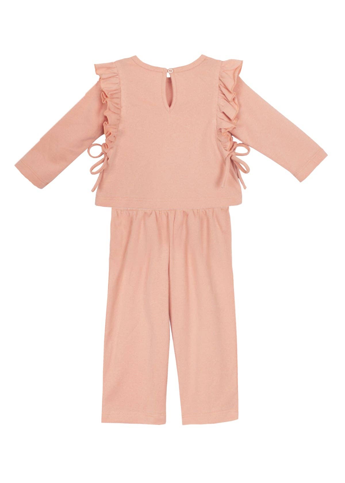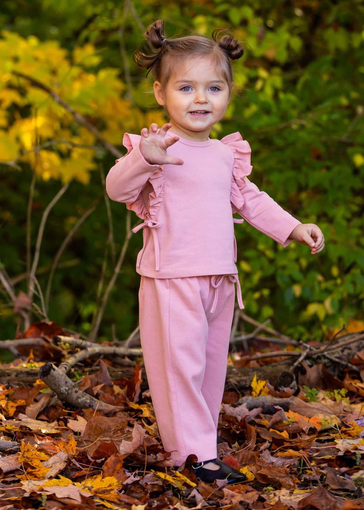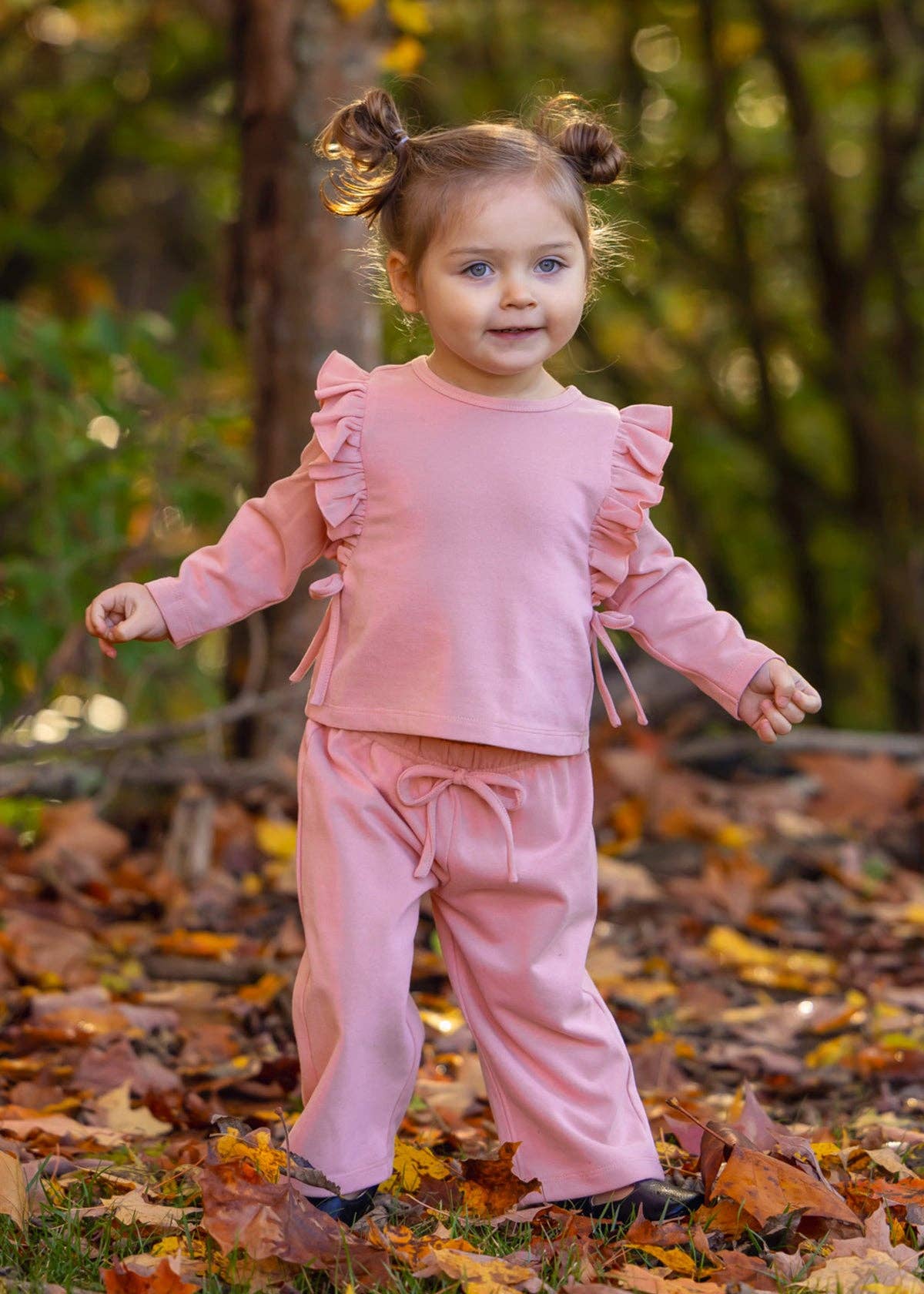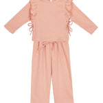 This girl's two piece set in a warm blush hue features a top with charming ruffle details along the shoulders and side ties for an adjustable fit. The matching wide-leg pants offer a relaxed silhouette with an elastic waistband, making this outfit both stylish and comfortable for everyday wear.