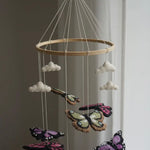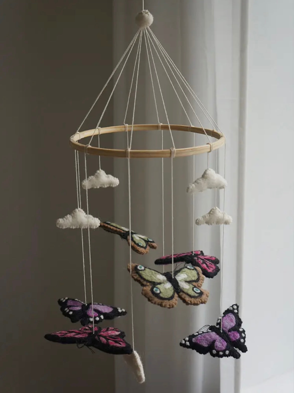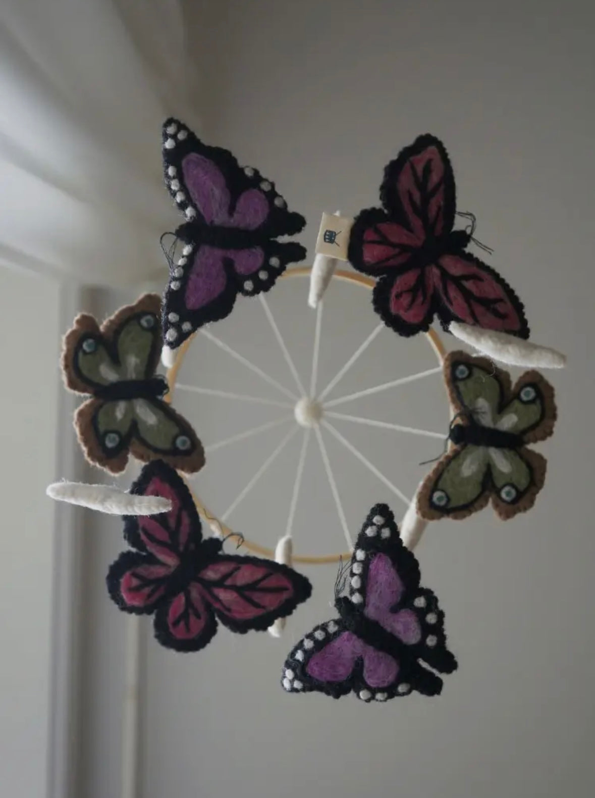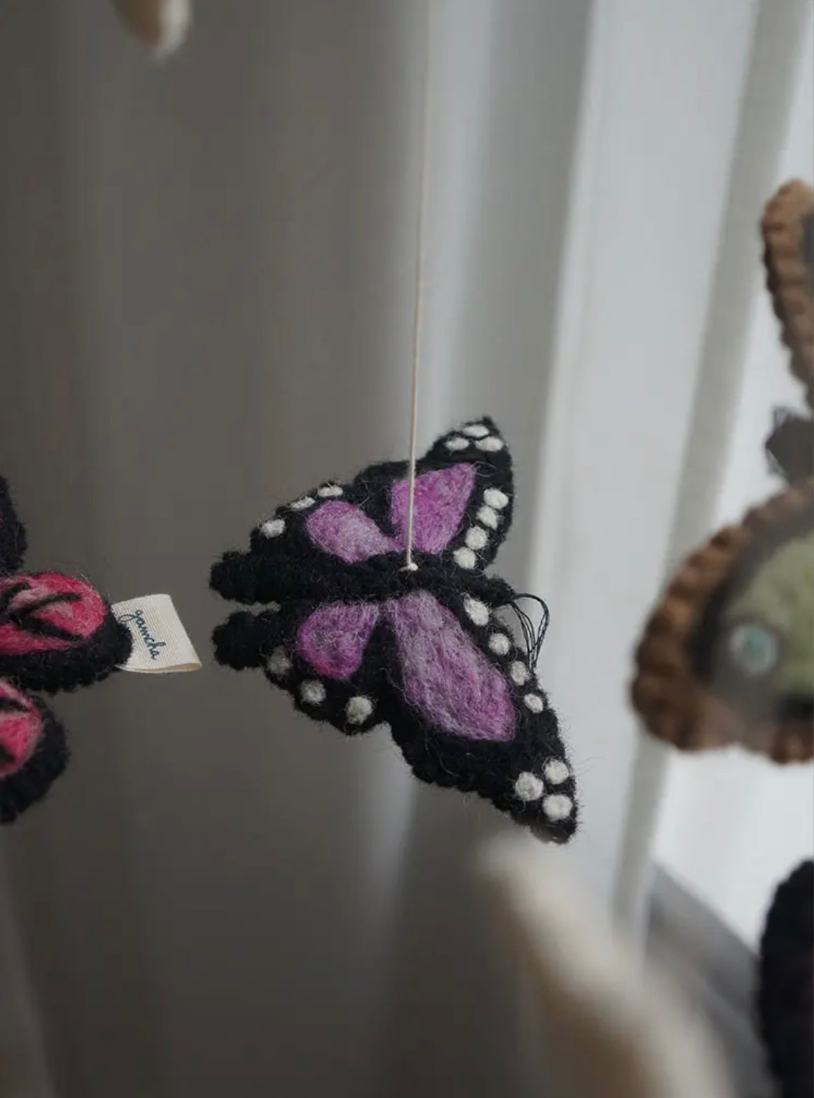 Beautiful and detailed mobile with butterflies. The mobile is beautifully wrapped with a cute ribbon — perfect gift to a babyshower, birthday or as a maternity gift.