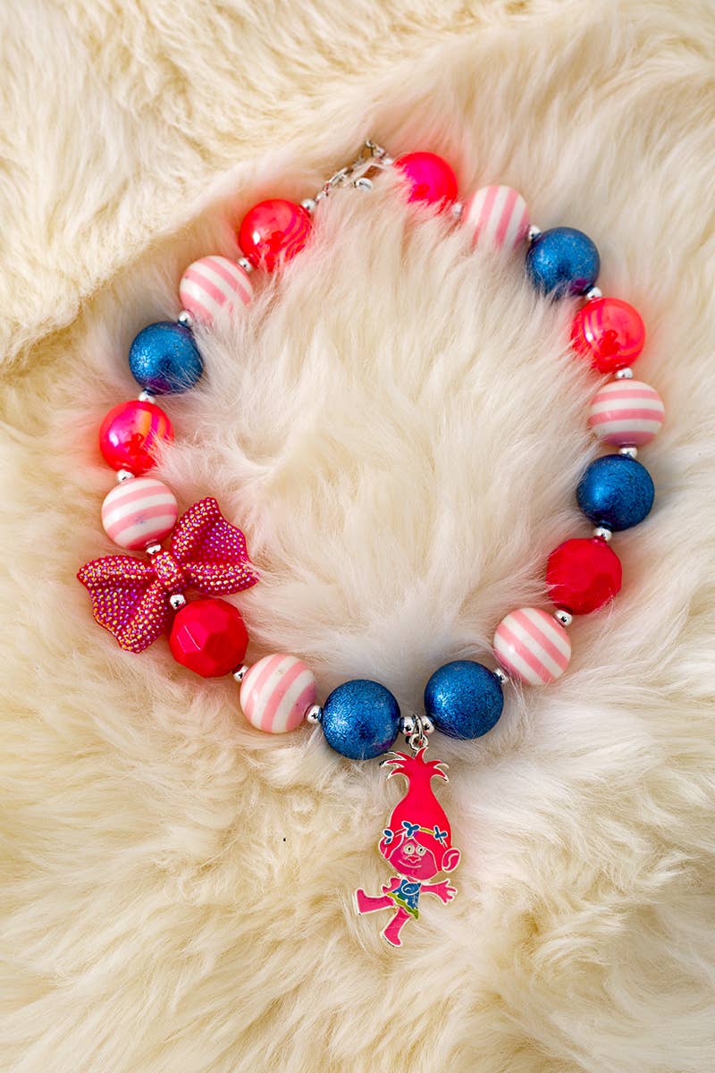Add some fun and flair to your outfit with our Trolls Queen Poppy bubble bead necklace! Featuring a super cute queen poppy pendant and an adorable bow for additional flair! Perfect for July 4th or other occasions.