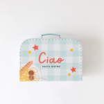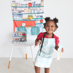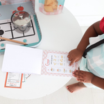 Ciao! Unleash your child's inner pasta chef with this imaginative play kit! Housed in a compact suitcase, this kit includes an oversized fabric poster, apron, 3 receipts, felt pasta in a resealable pouch, wooden spoon, metal pot and a 50 page order notepad. Inside the suitcase, discover a captivating kitchen scene that complements the pasta shop theme, providing hours of pretend play and creative fun. Encourage a love for cooking and learning with the Ciao Pasta Bistro Play Kit.