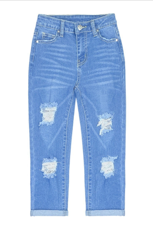 Premium Wash Mini-Mom Relax Fit High Rise Jeans W/ Distress and Roll up