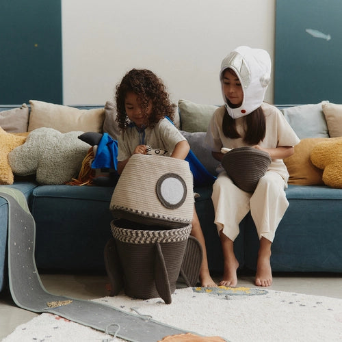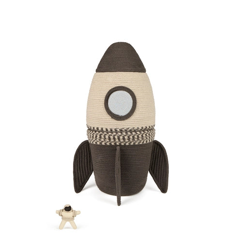 The Rocket Storage Basket is a stackable, handcrafted cotton rope basket set made from recycled PET bottles, transforming into a spaceship complete with a mini astronaut toy, blending eco-friendly design, imaginative play, and smart storage. Suitable for ages 3+.
