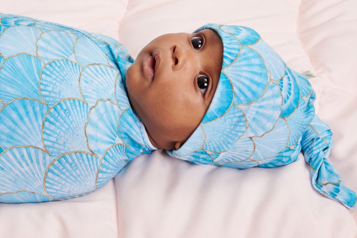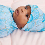 Crown your baby with the serene beauty of the Seashell Serenade Cap made of bamboo. Featuring an elegant seashell motif in calming blues, this buttery-soft Ānanda Bambu piece ensures a snug, comforting fit, perfect for cherishing those precious seaside-inspired moments.