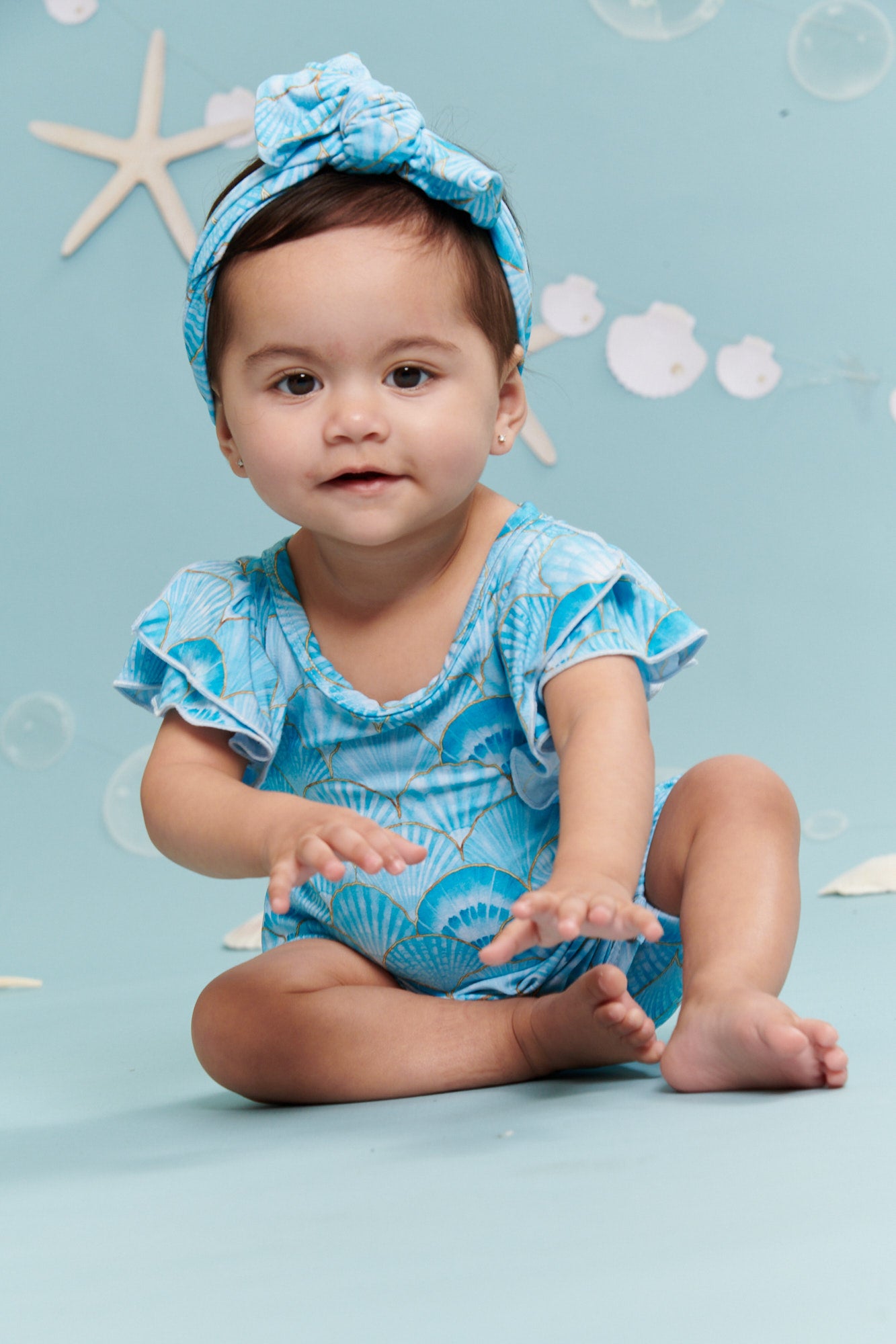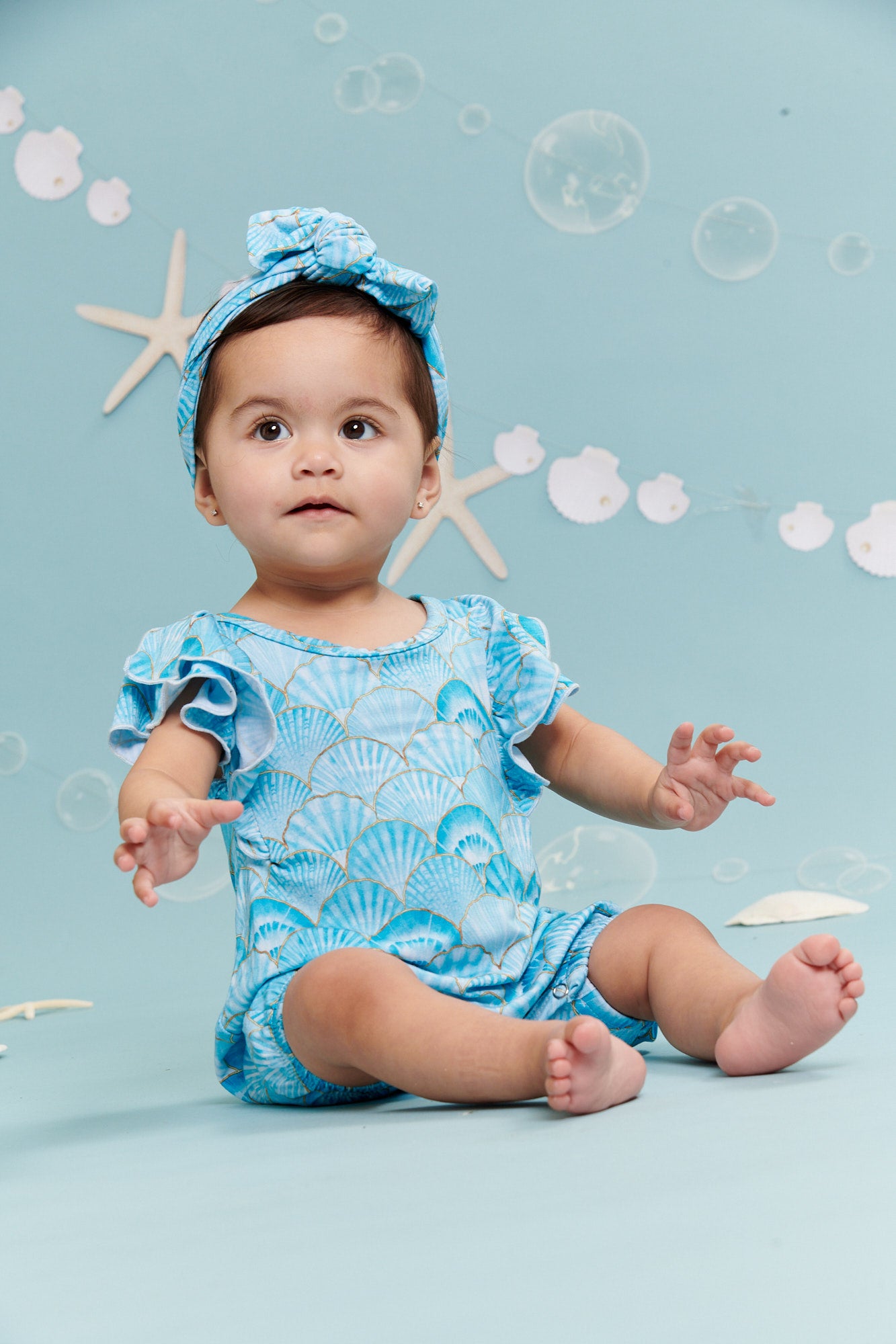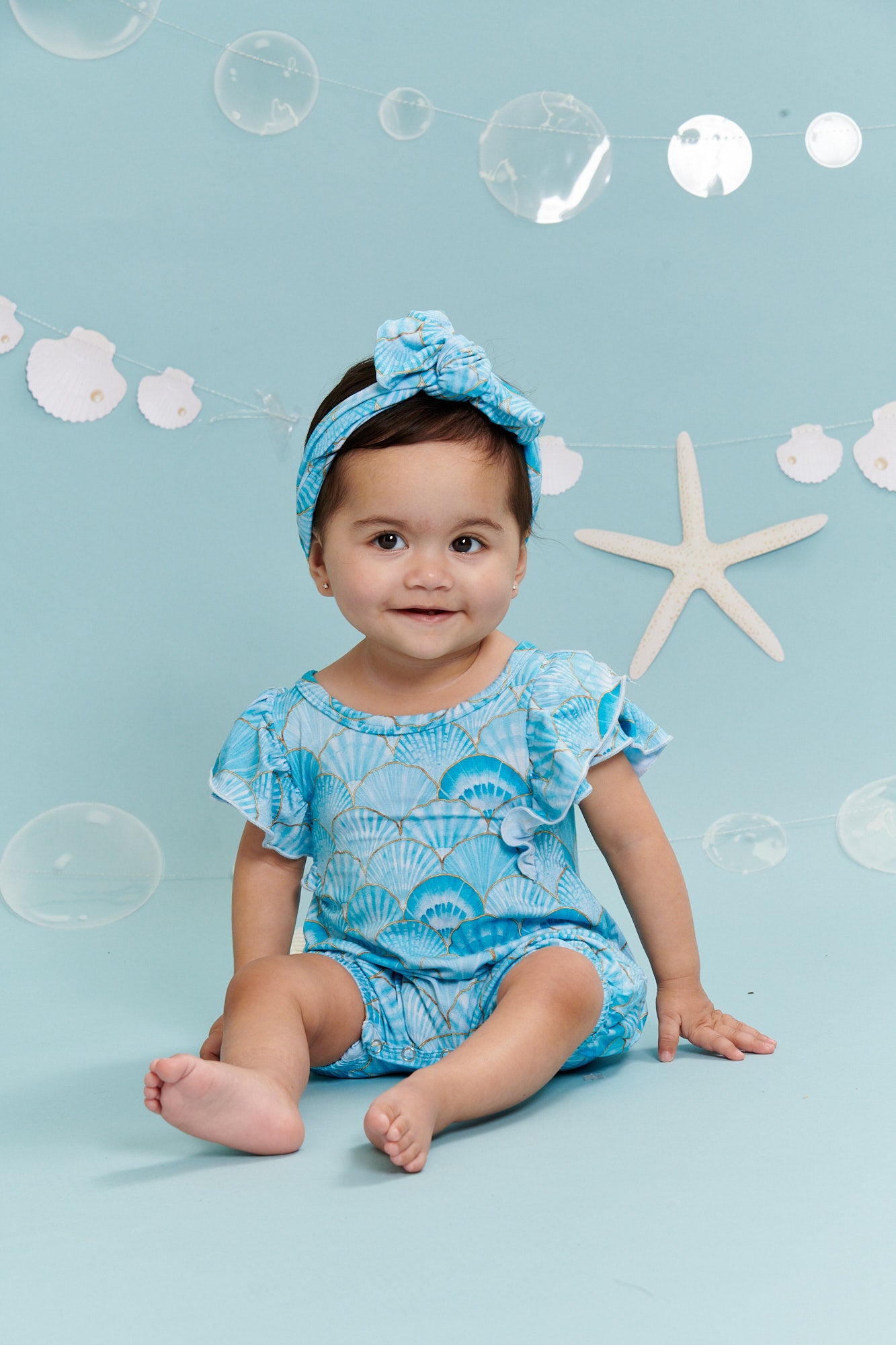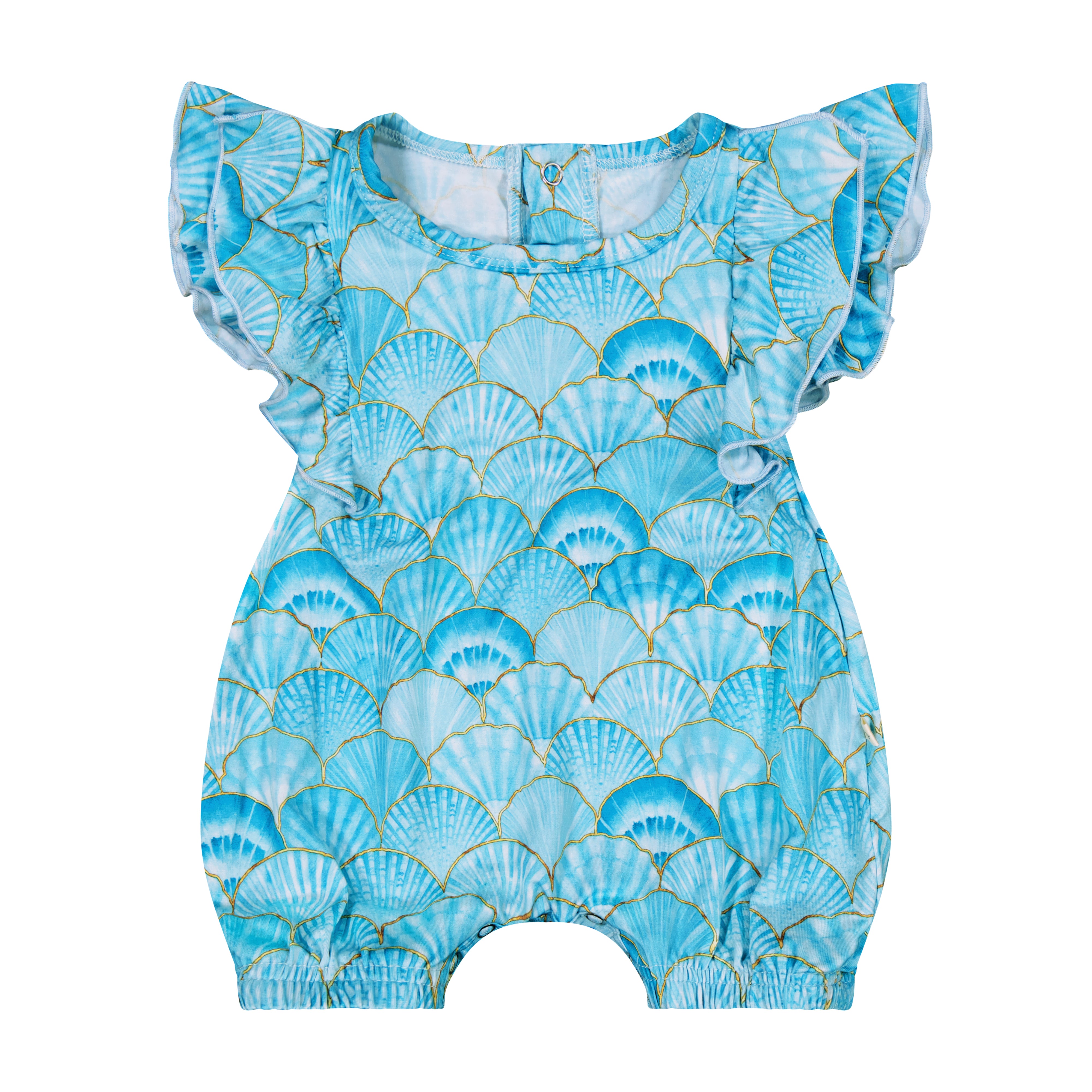 Embrace coastal charm with the Seashell Serenade Ruffle Sleeve Shorty Romper made of bamboo. Featuring delicate seashells in soothing shades of blue, this romper is a playful yet elegant choice for sunny days. Made from the irresistibly soft Ānanda Bambu fabric, it ensures your little one stays cool, comfortable, and effortlessly stylish wherever the tides may take them.