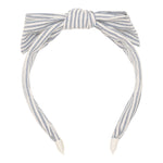 Crafted from super soft blue and white striped fabric with double layer central bow and grosgrain ribbon wrapped ends
