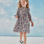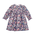 Sumptuous and colorful print, Kidiwi has hand-smocked and embroidered delicate golden flowers on the side ruffles.