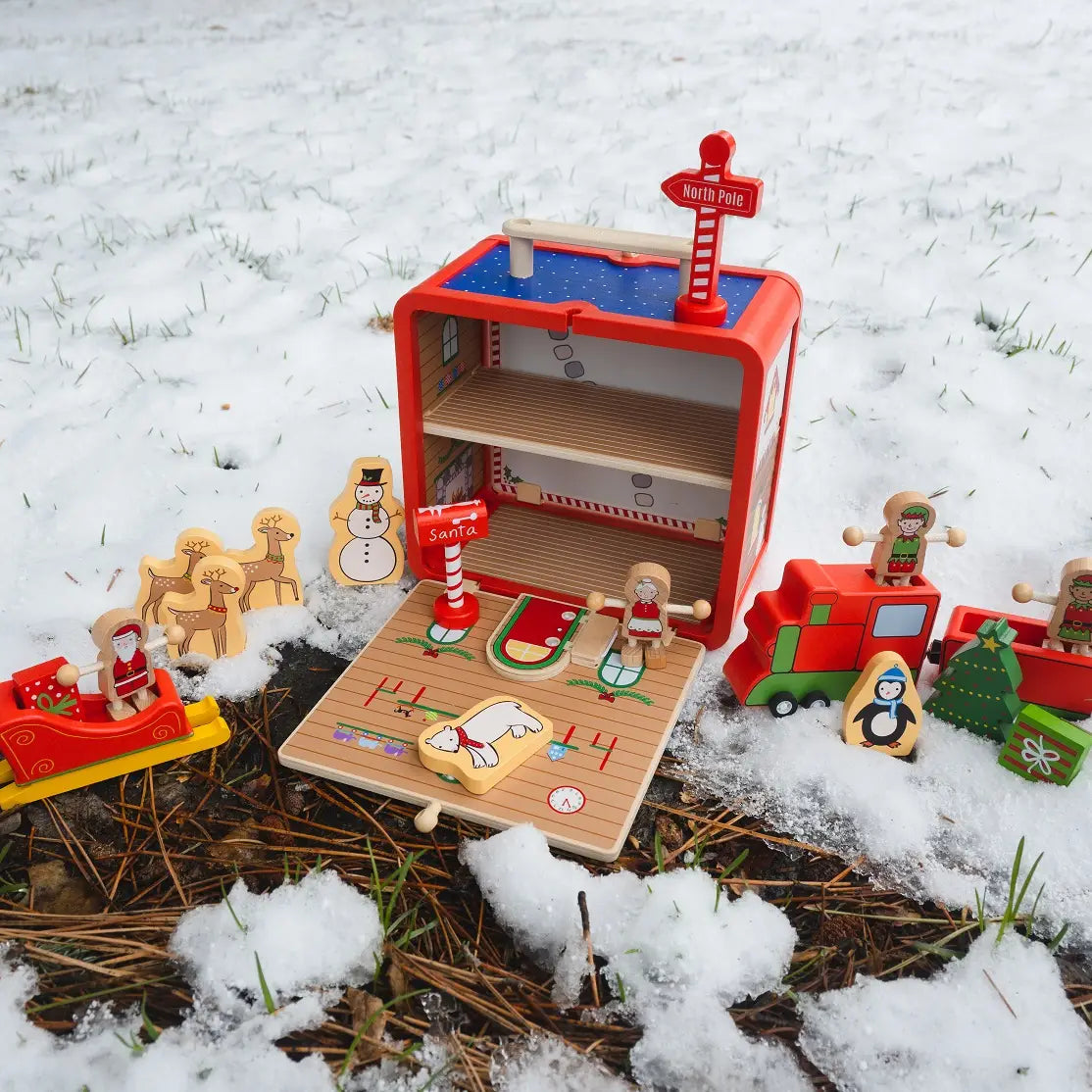 Our new Suitcase Series encourages portable play. Each suitcase opens up on both sides to reveal a world of fun. The 18-piece Santa's Workshop has everything for whimsical Christmas fun on the go all year long, including Mr. & Mrs. Claus, elves, sleigh, reindeer, and more!