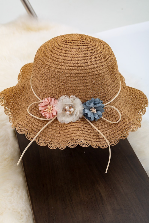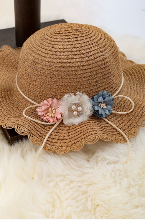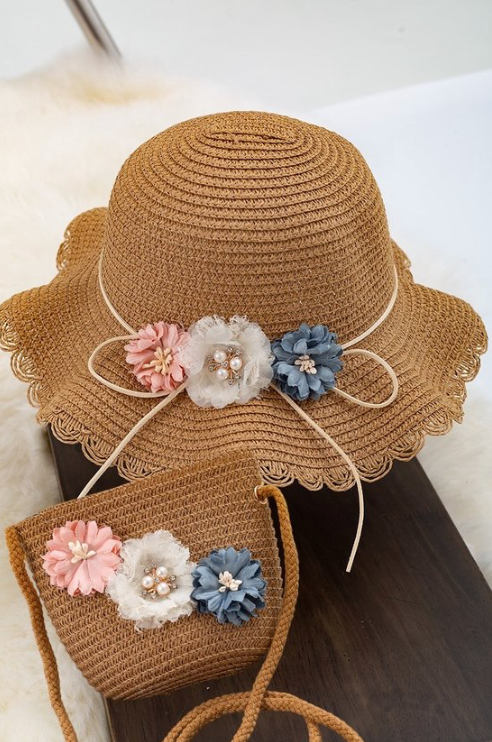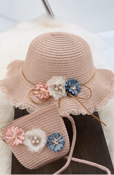 Complementing the hat is a matching straw bag, creating a coordinated and stylish look. The bag is just the right size for your little one to carry their treasures, making it an ideal accessory for picnics, outings, or even a day at the beach.