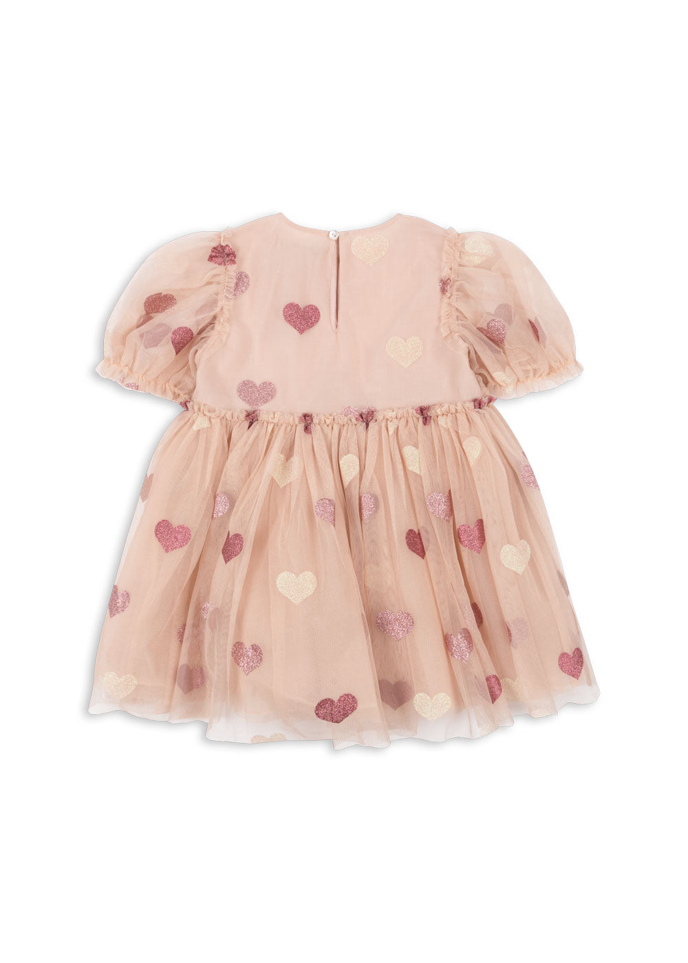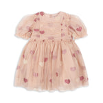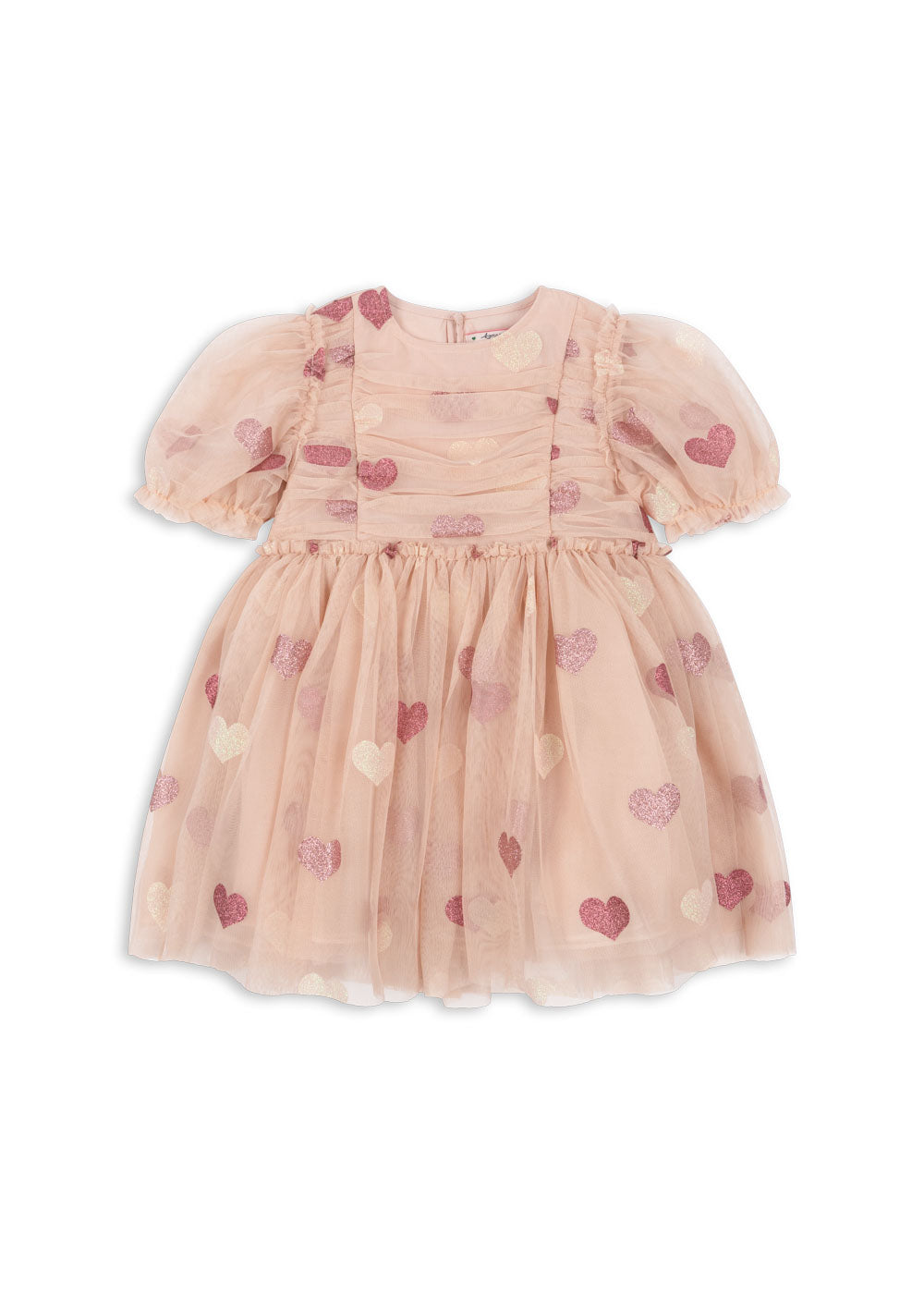 Tullie dress has puff sleeves, a ruched top part with sheer tulle, and a voluminous skirt.