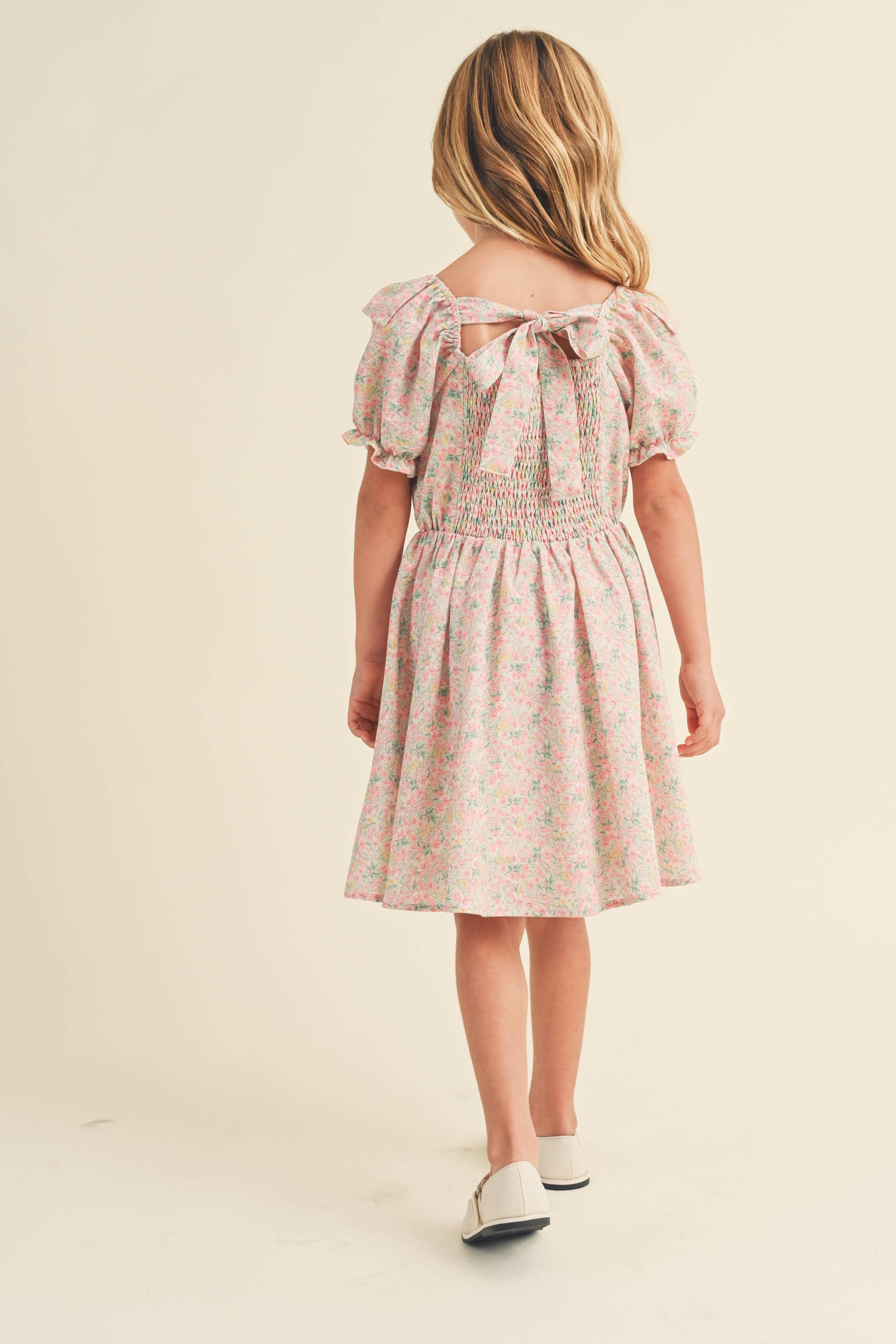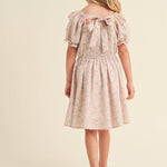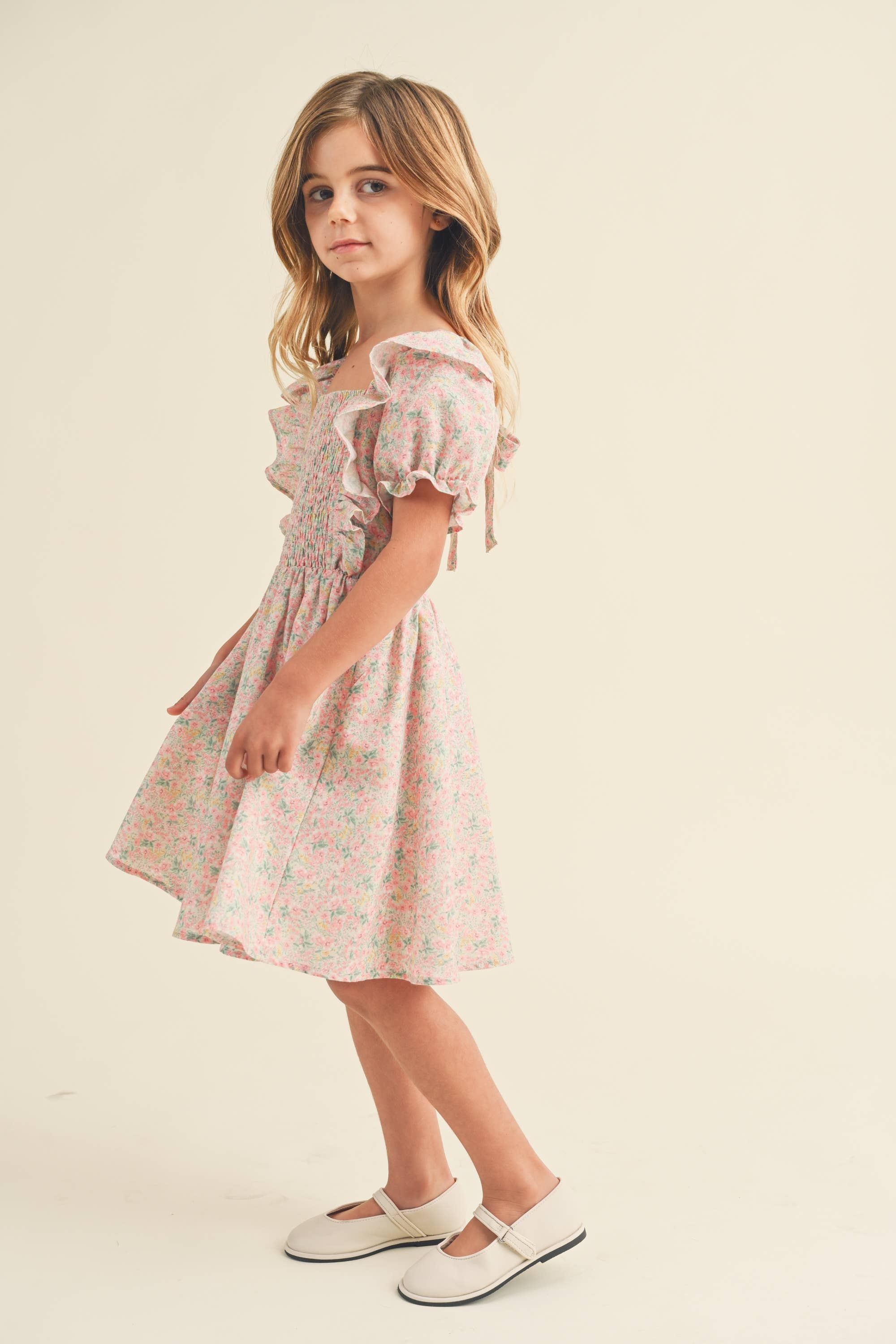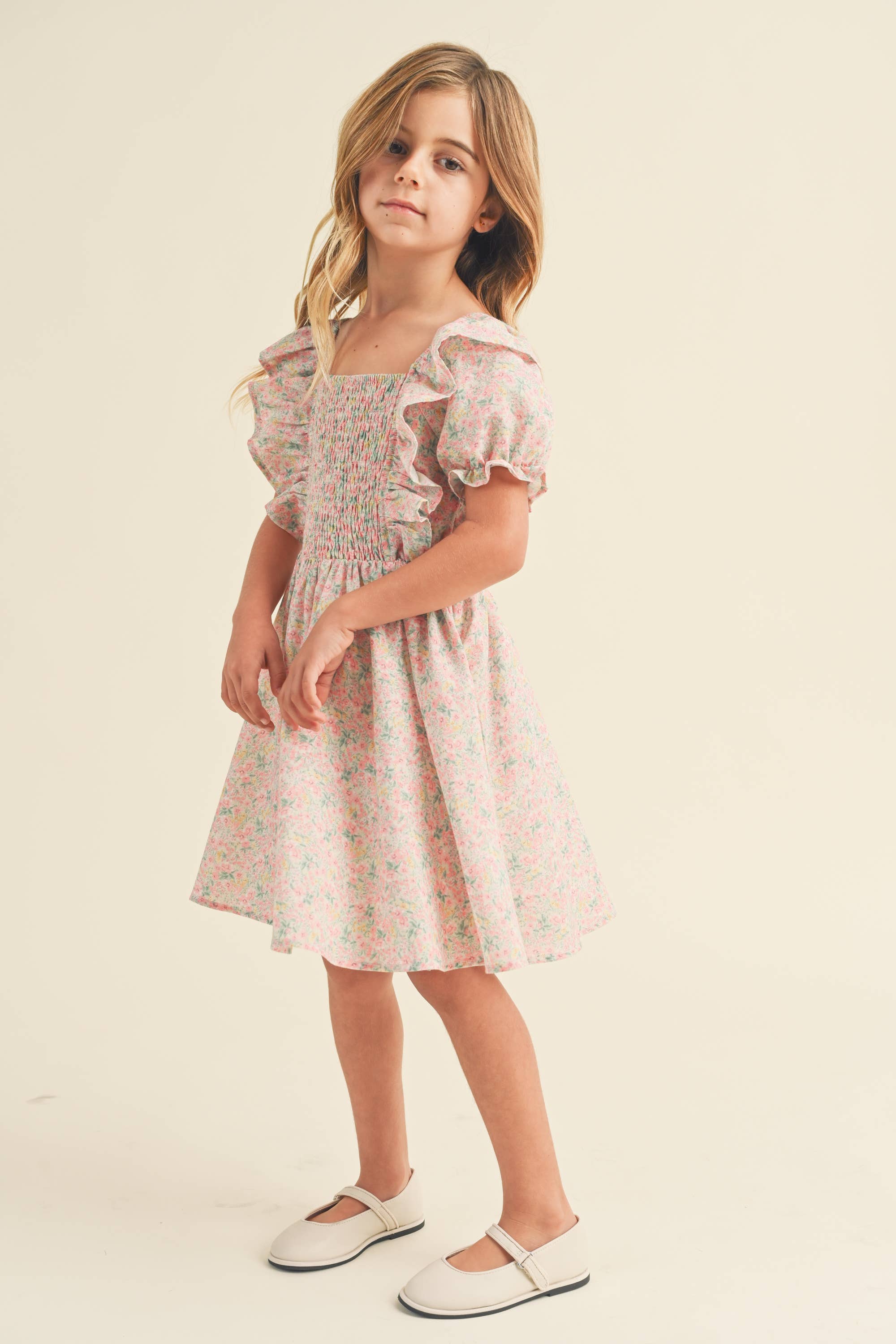 A charming fit & flare dress featuring a smocked bodice, ruffle details, and a vibrant woven floral print.