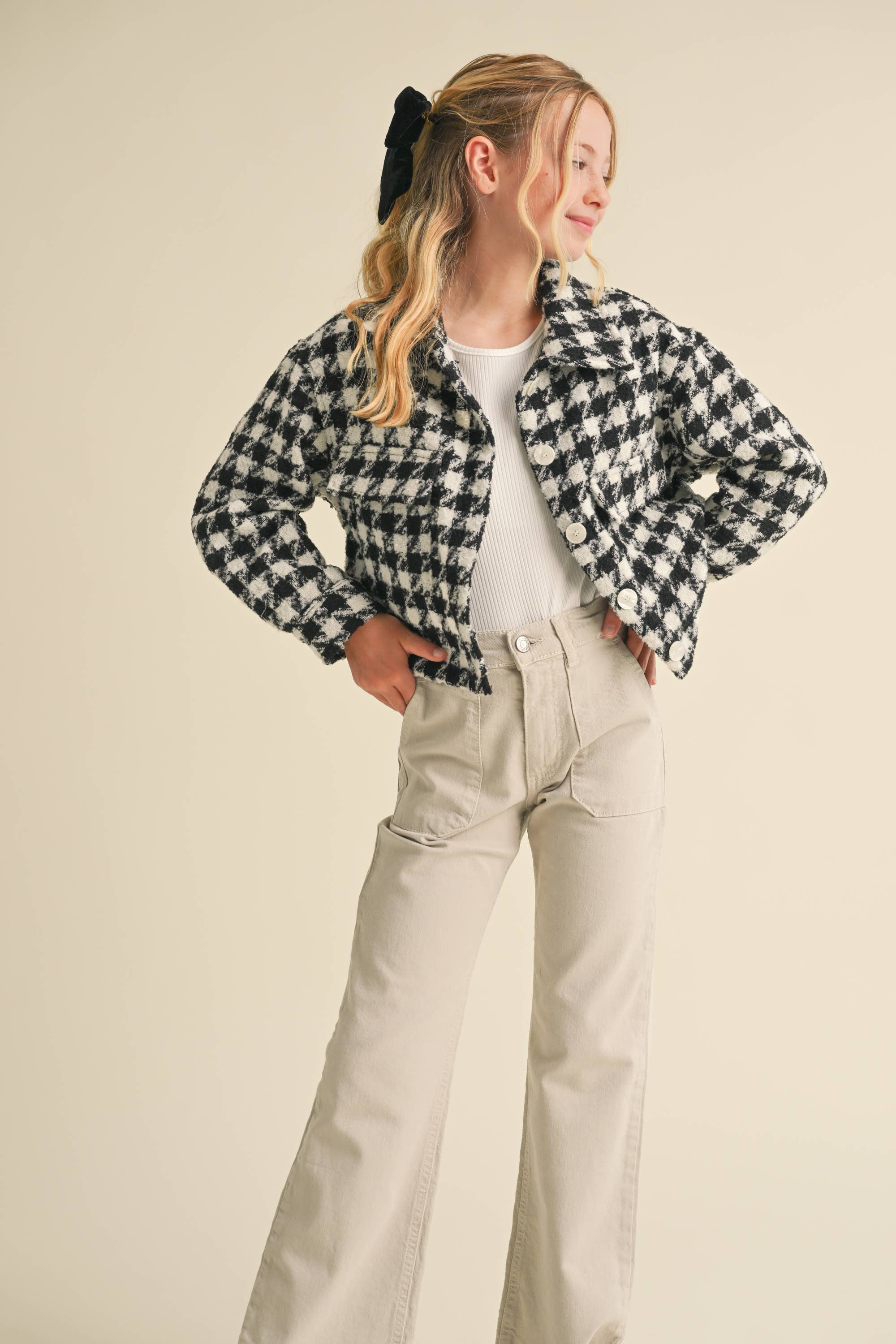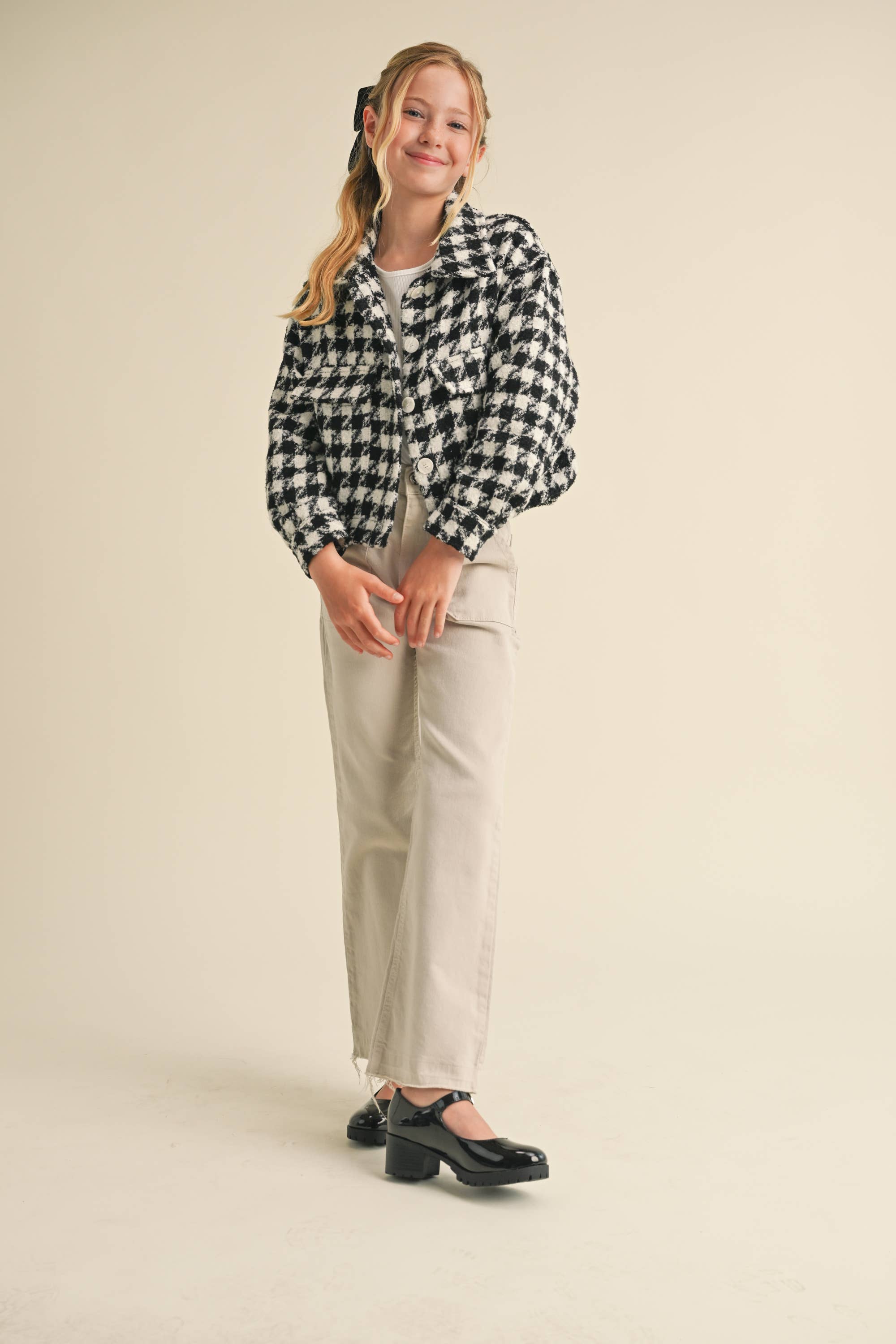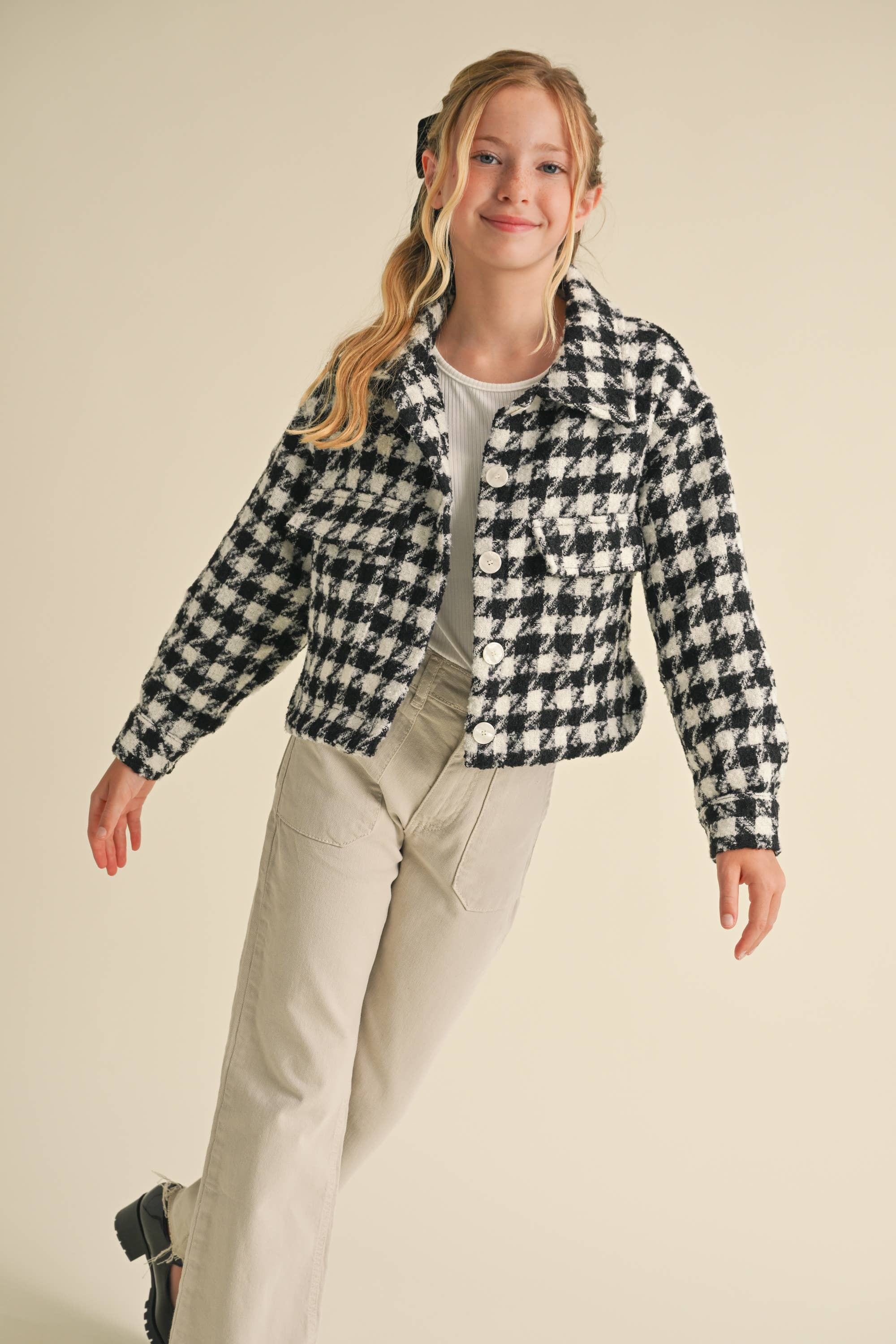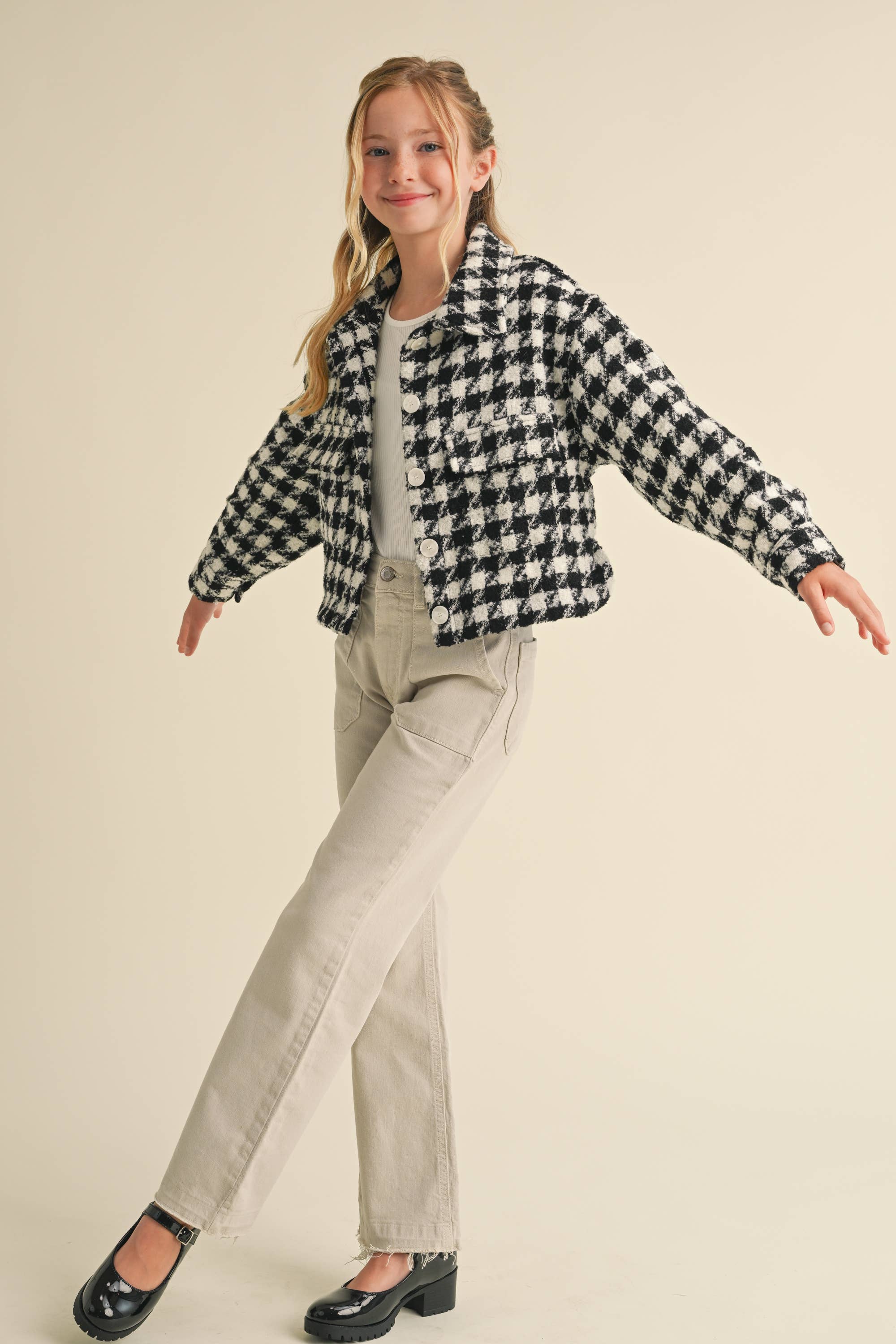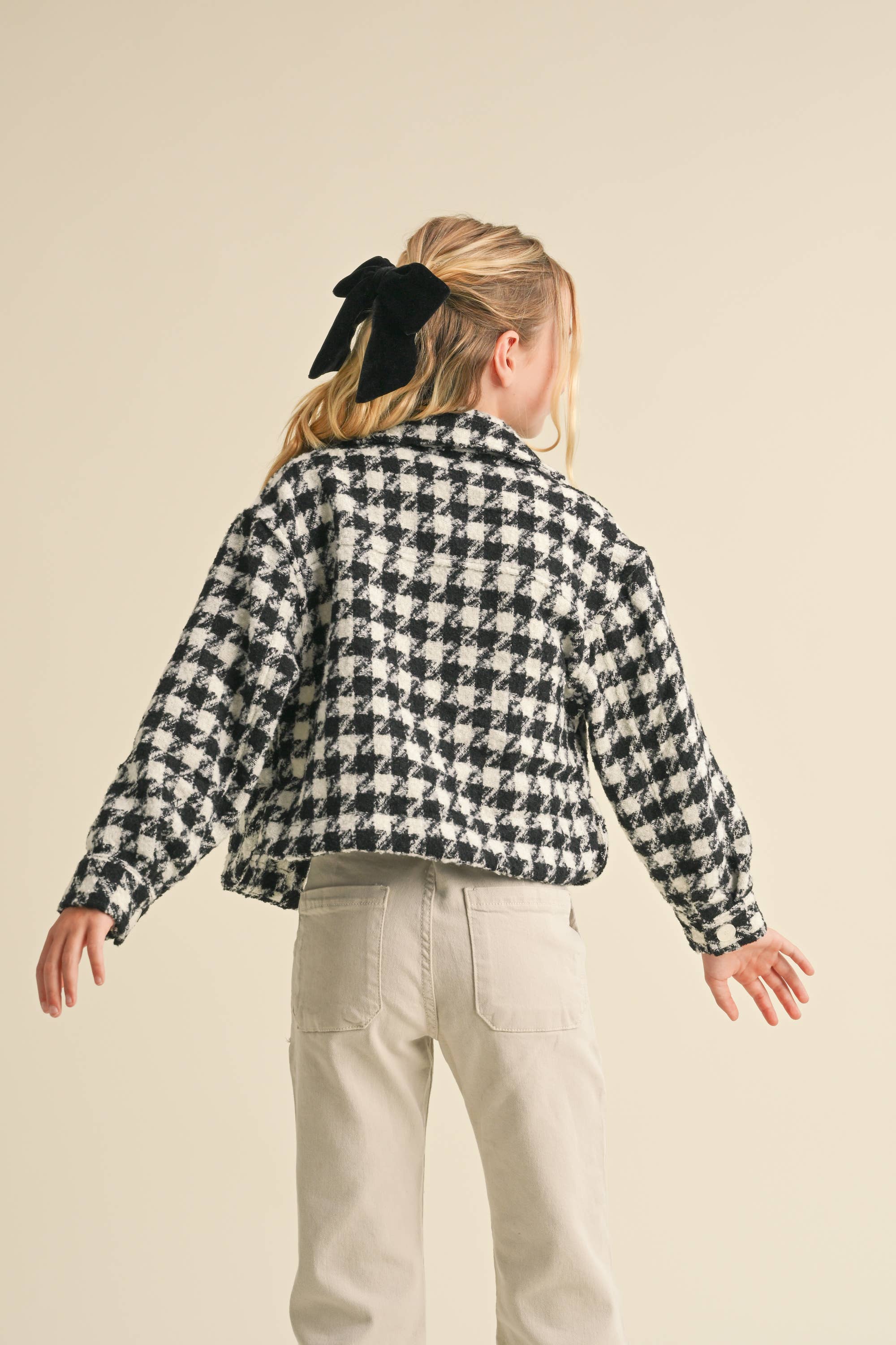 Elevate your little one's style with this girls Boucle Tweed Houndstooth Jacket, designed for both comfort and elegance. Whether it's camp, school, travel, bike rides, photoshoots, or family days, this jacket is a wonderful everyday choice for trendy kids.