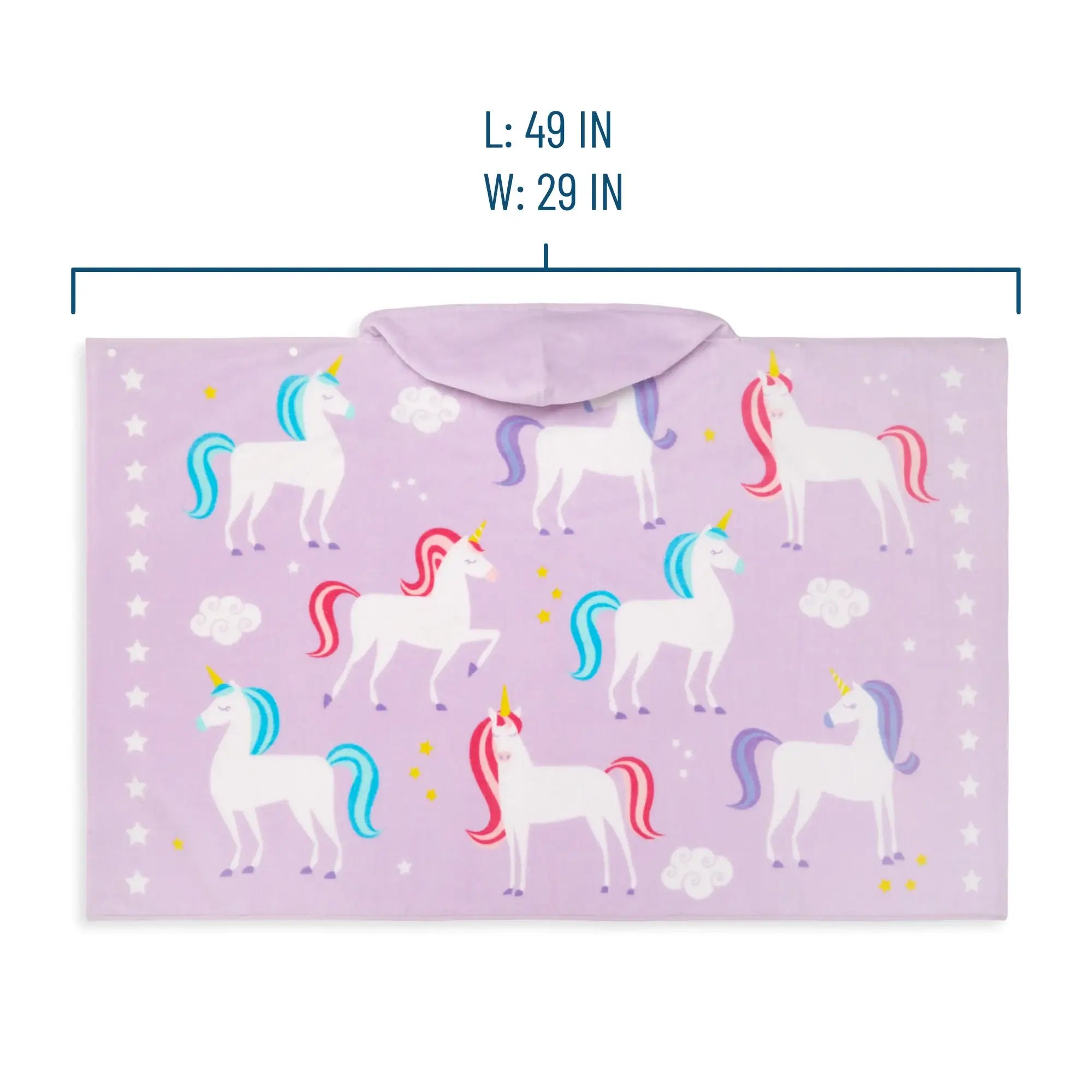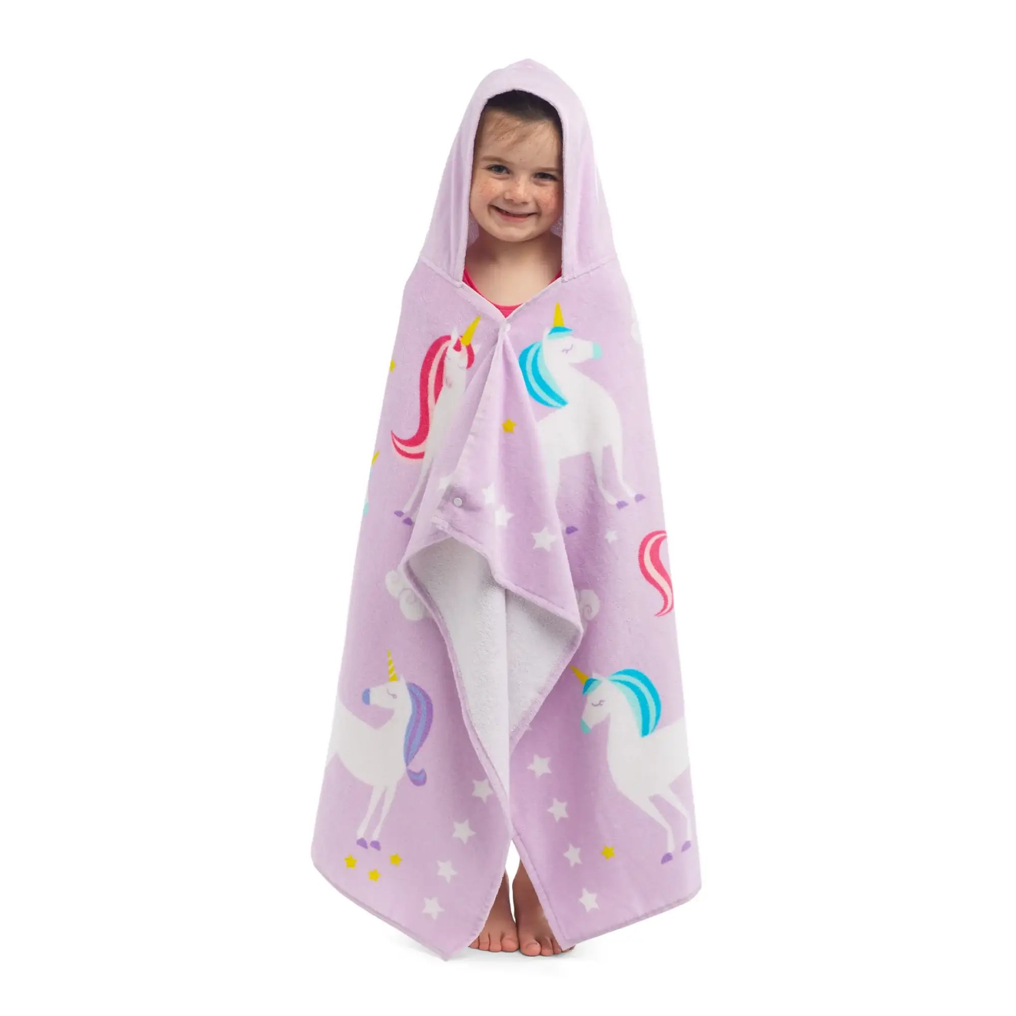Details: Make a splash at the beach or pool with Wildkin's unicorn beach poncho in purple for boys and girls! Perfect for after-bath-time snuggles, this hooded wrap keeps kids warm and dry. made of the highest quality, OEKO-TEX certified, super soft absorbent plush cotton terry. Perfect for growing toddlers or kids, ages 3 and up or heights 33-52". coordinates with other Wildkin items. Product info: Perfect for the pool, beach, or bath time 100% Cotton OEKO-TEX certified Snap front Spacious hood Soft velour exterior for a plush feel Cotton terry interior for absorption. Care: Machine wash warm, gentle cycle, only non-chlorine bleach when needed, tumble dry low, remove promptly, warm iron as needed.