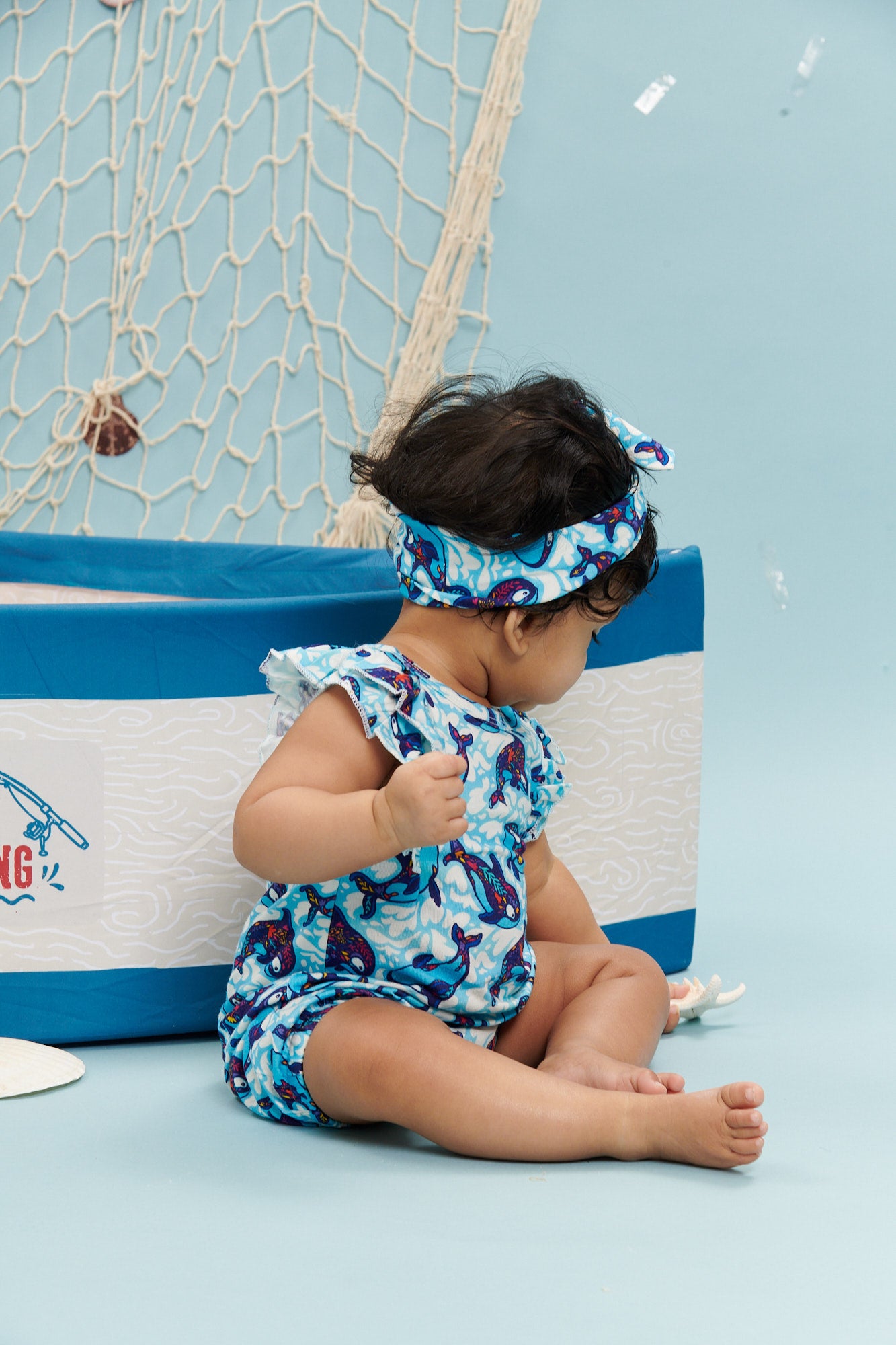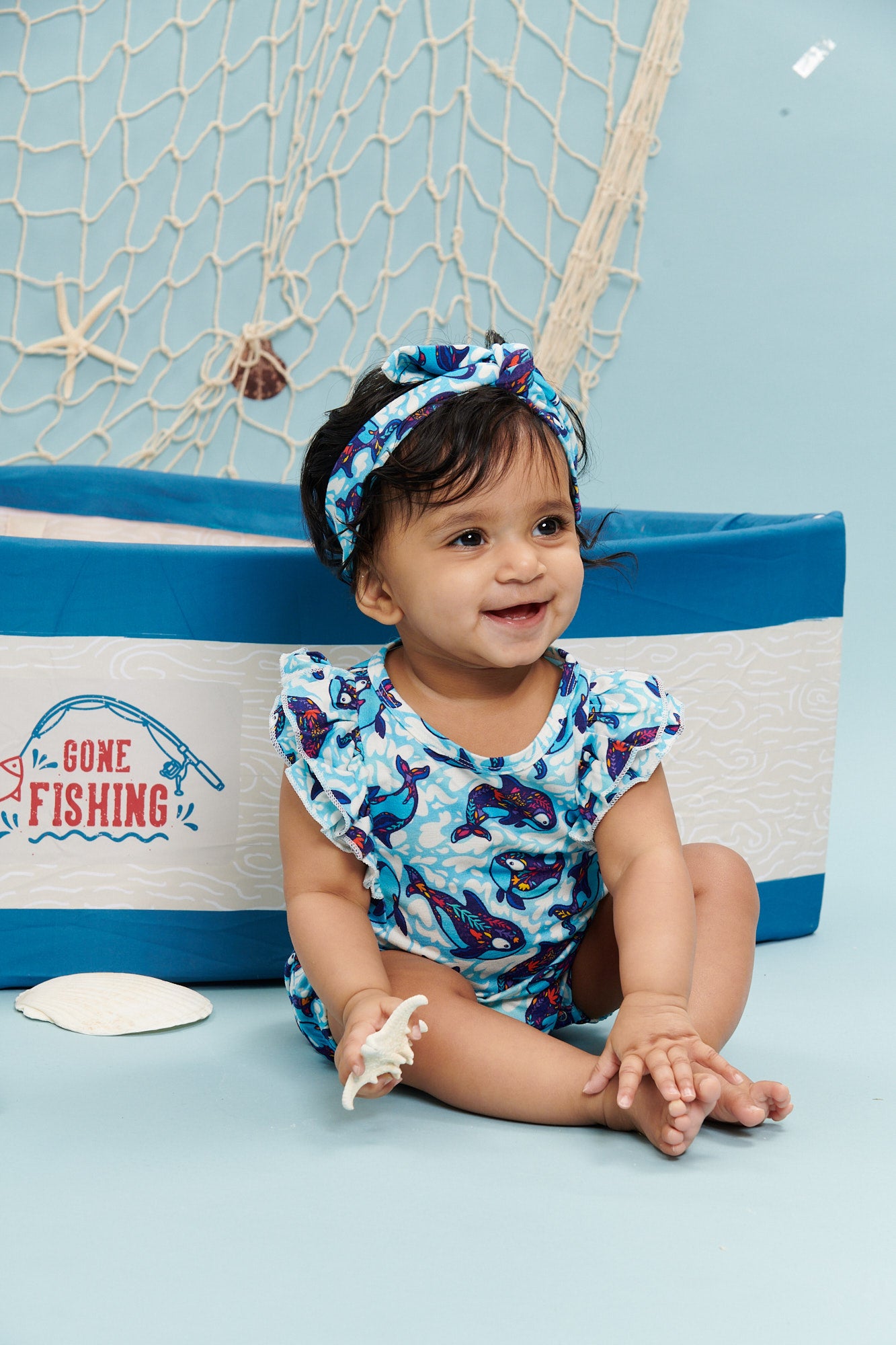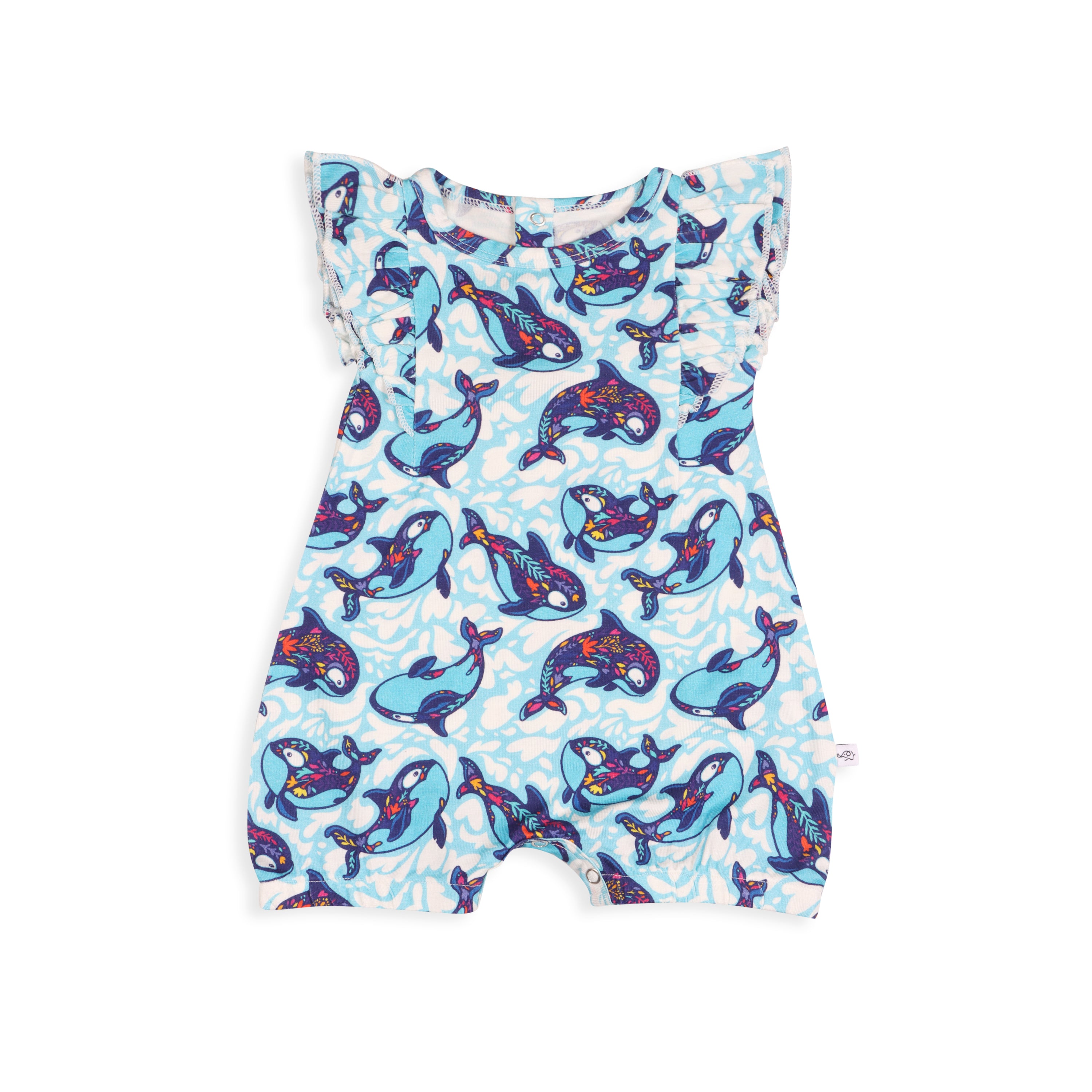 The Whaley Good Time Ruffle Sleeve Shorty Romper is the ultimate summer staple for little ocean enthusiasts! With its playful orca whale design and cute ruffle details, this bamboo romper is as fun as it is functional. Made from Ānanda Bambu, it offers lightweight comfort for warm, sunny days.