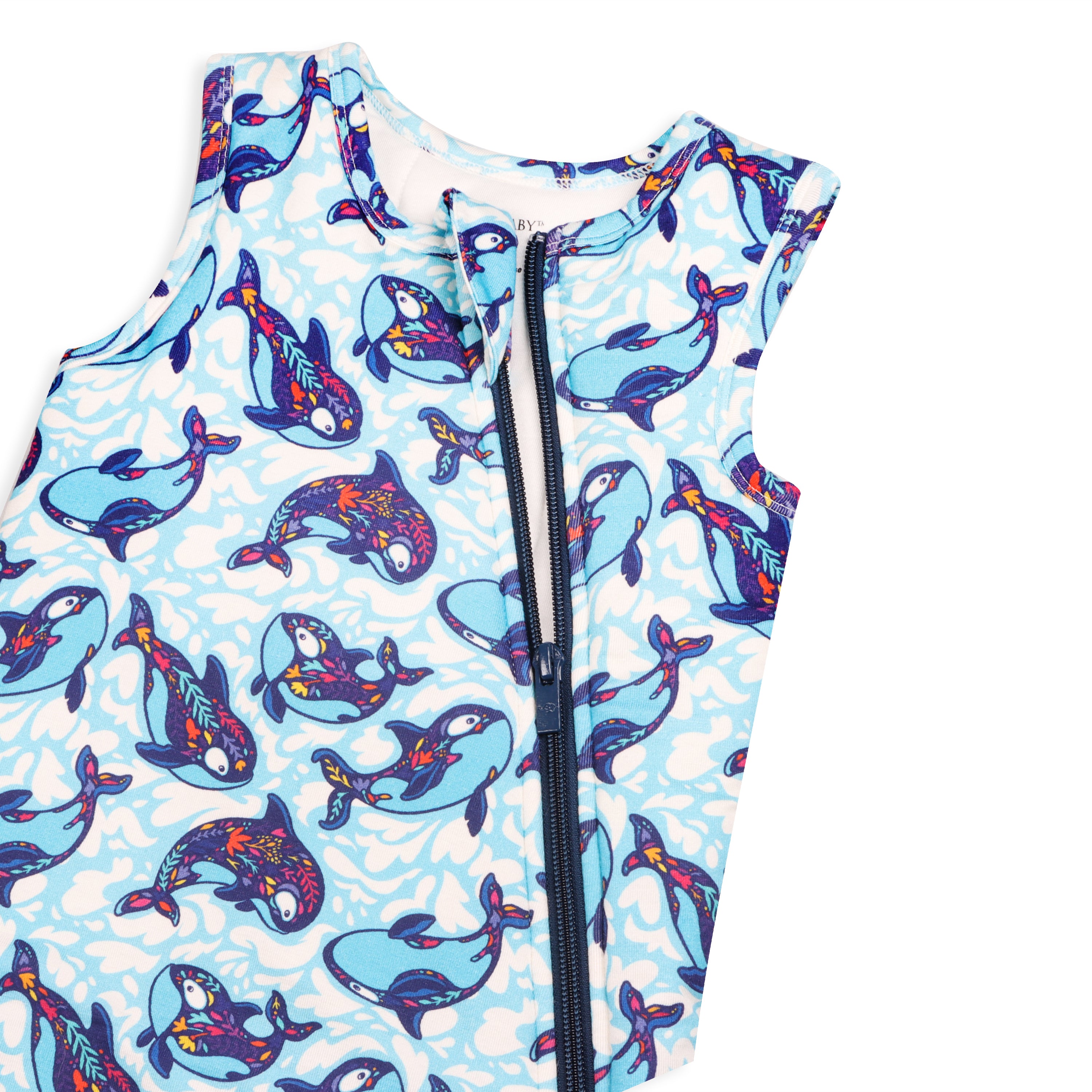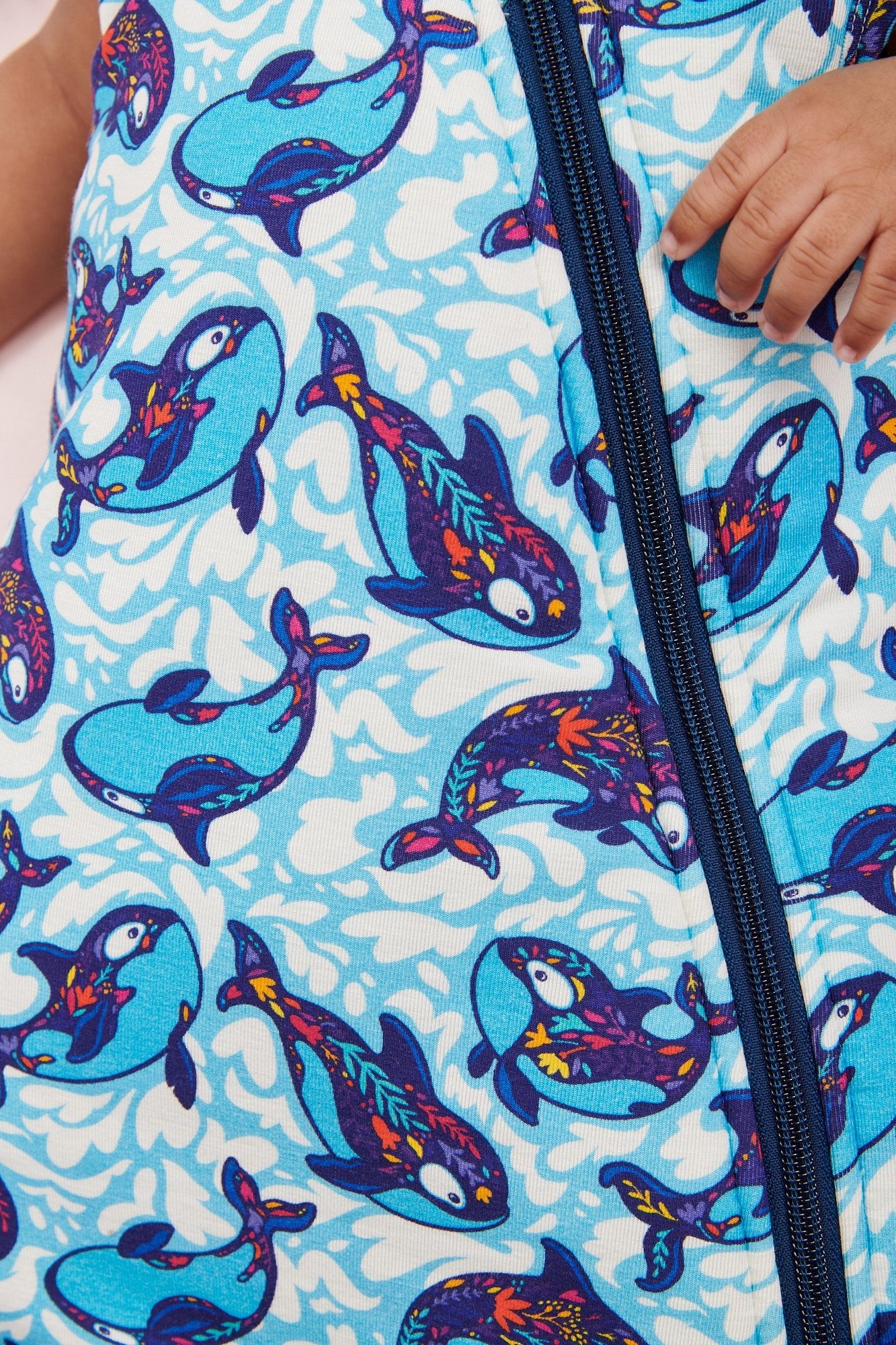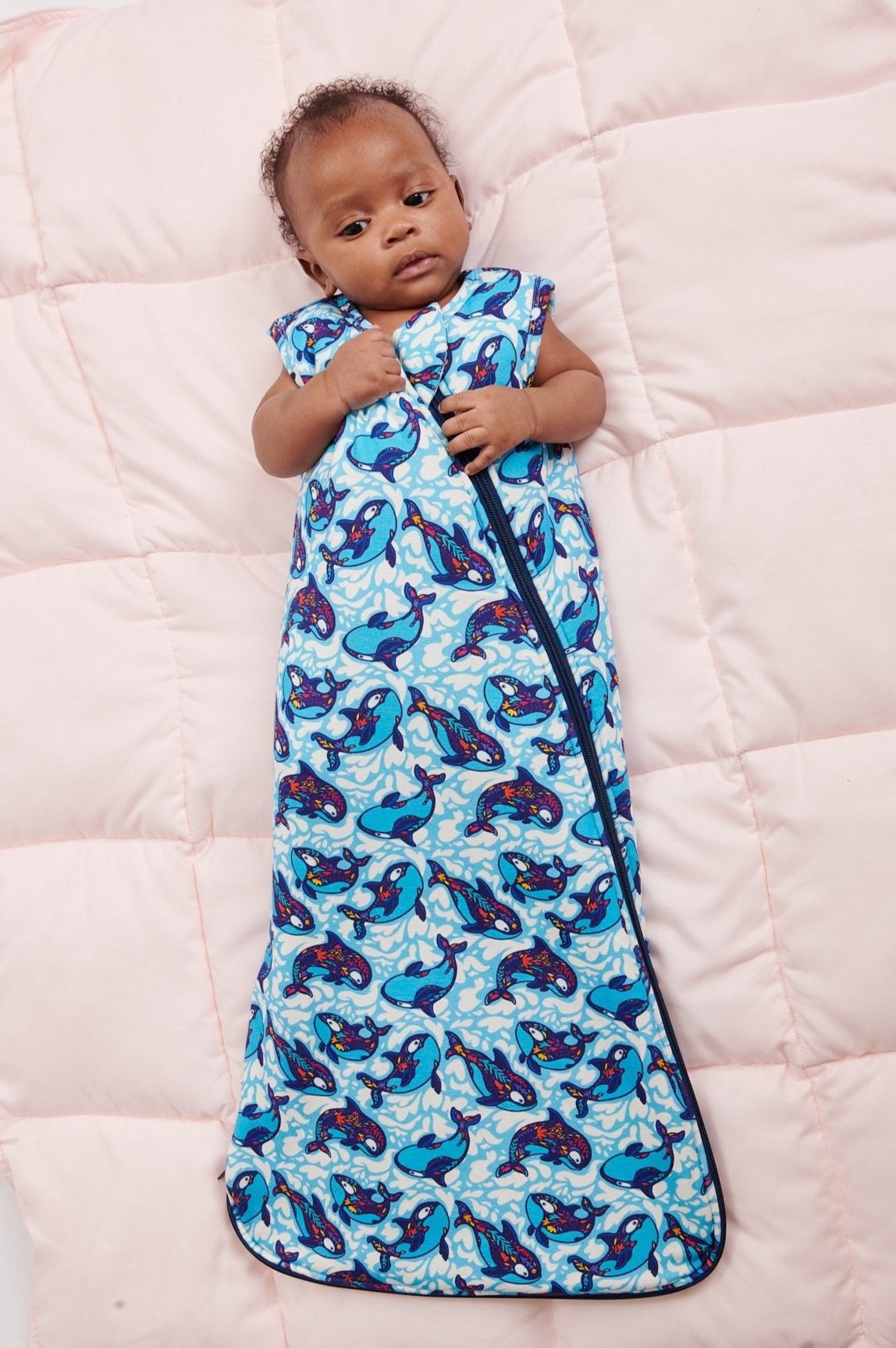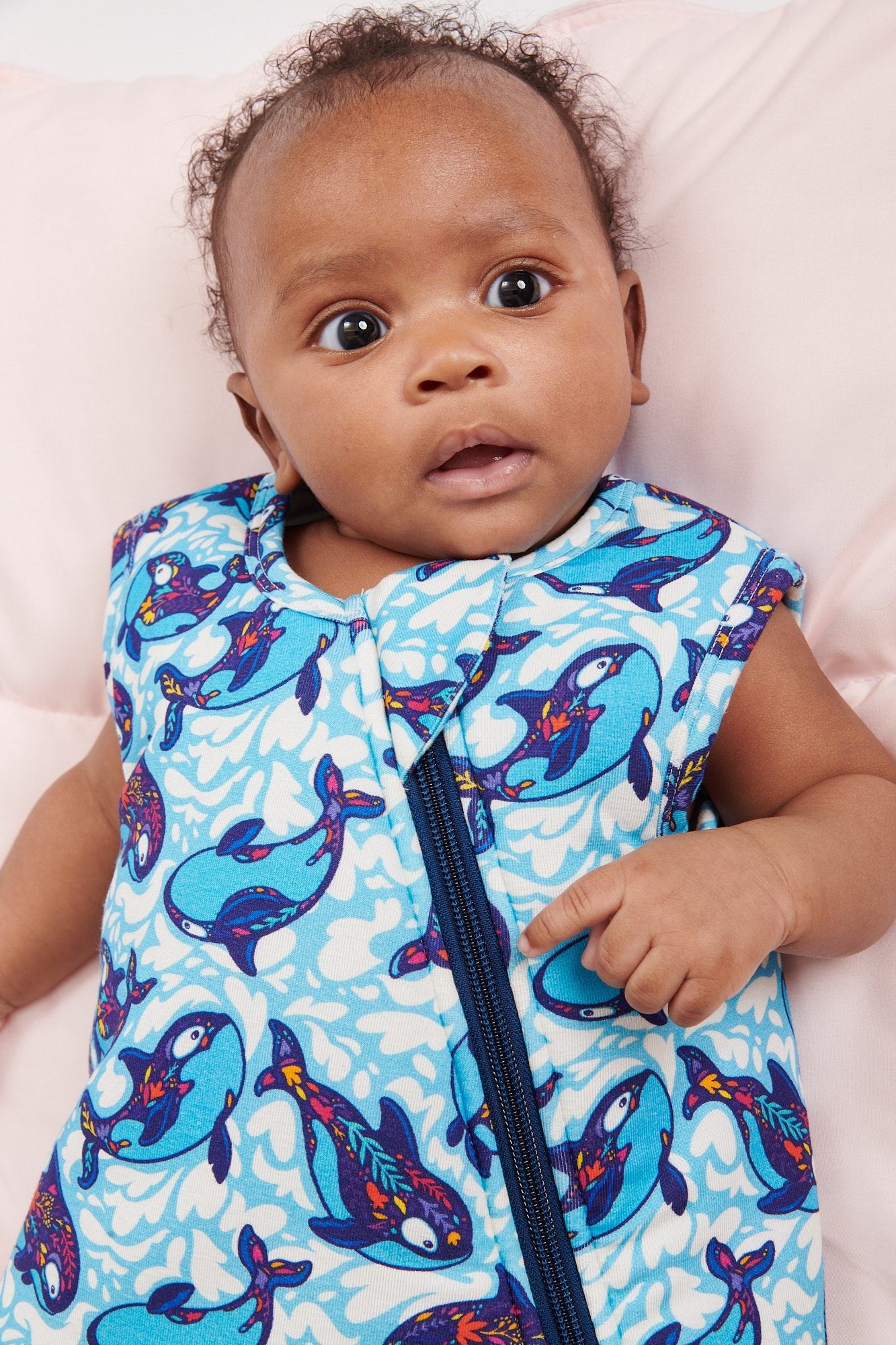 Sail off to sleep in the Whaley Good Time Sleep Bag! Adorned with adorable orca whales gliding through calm waters, this bamboo sleep bag wraps your baby in cozy, breathable softness. Made with premium Ānanda Bambu, it ensures a gentle and restful night’s sleep for your little one.