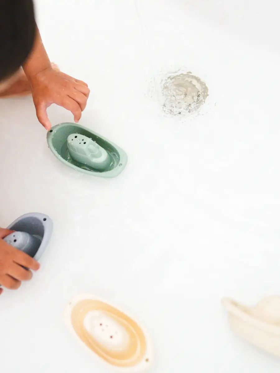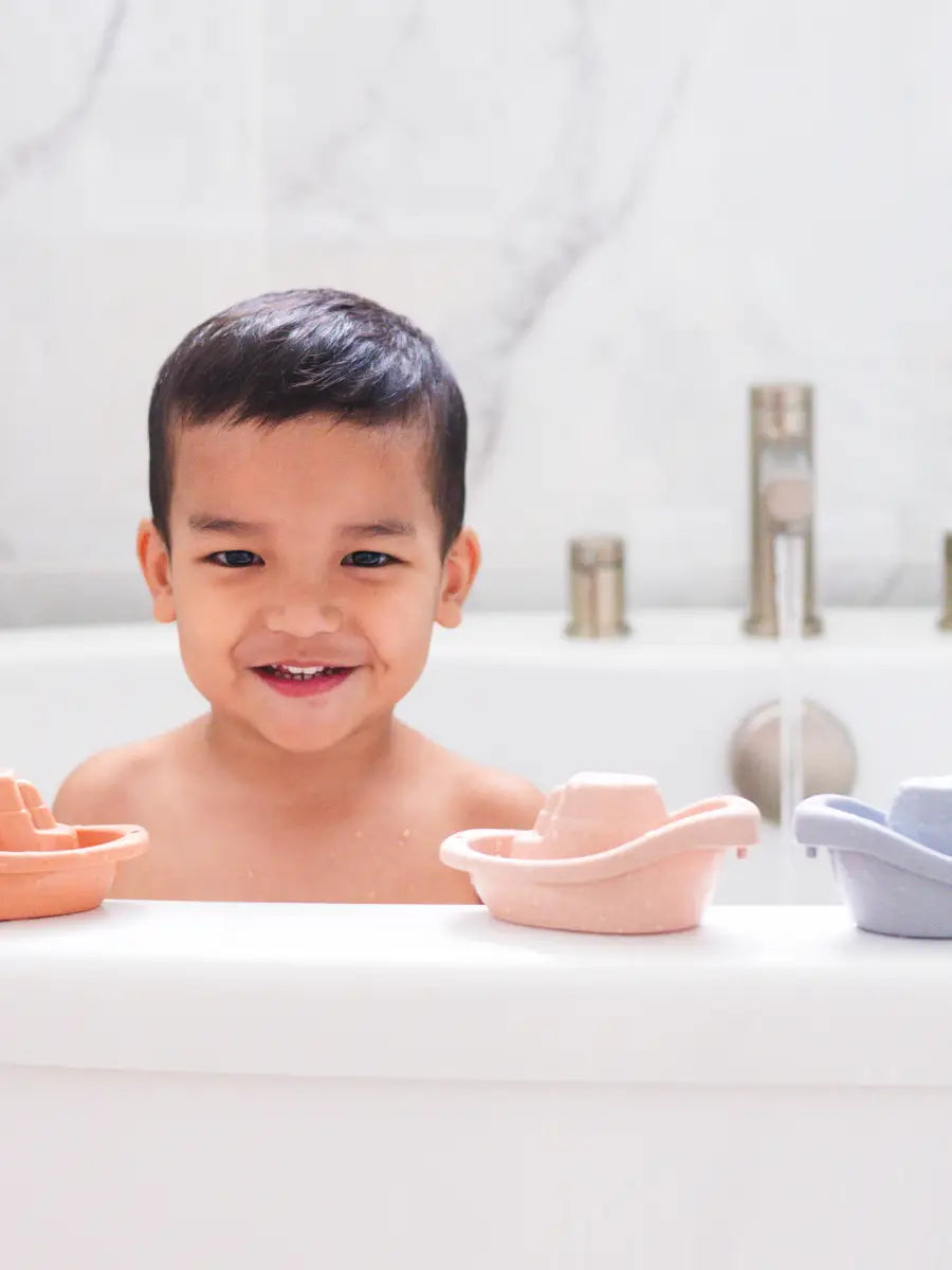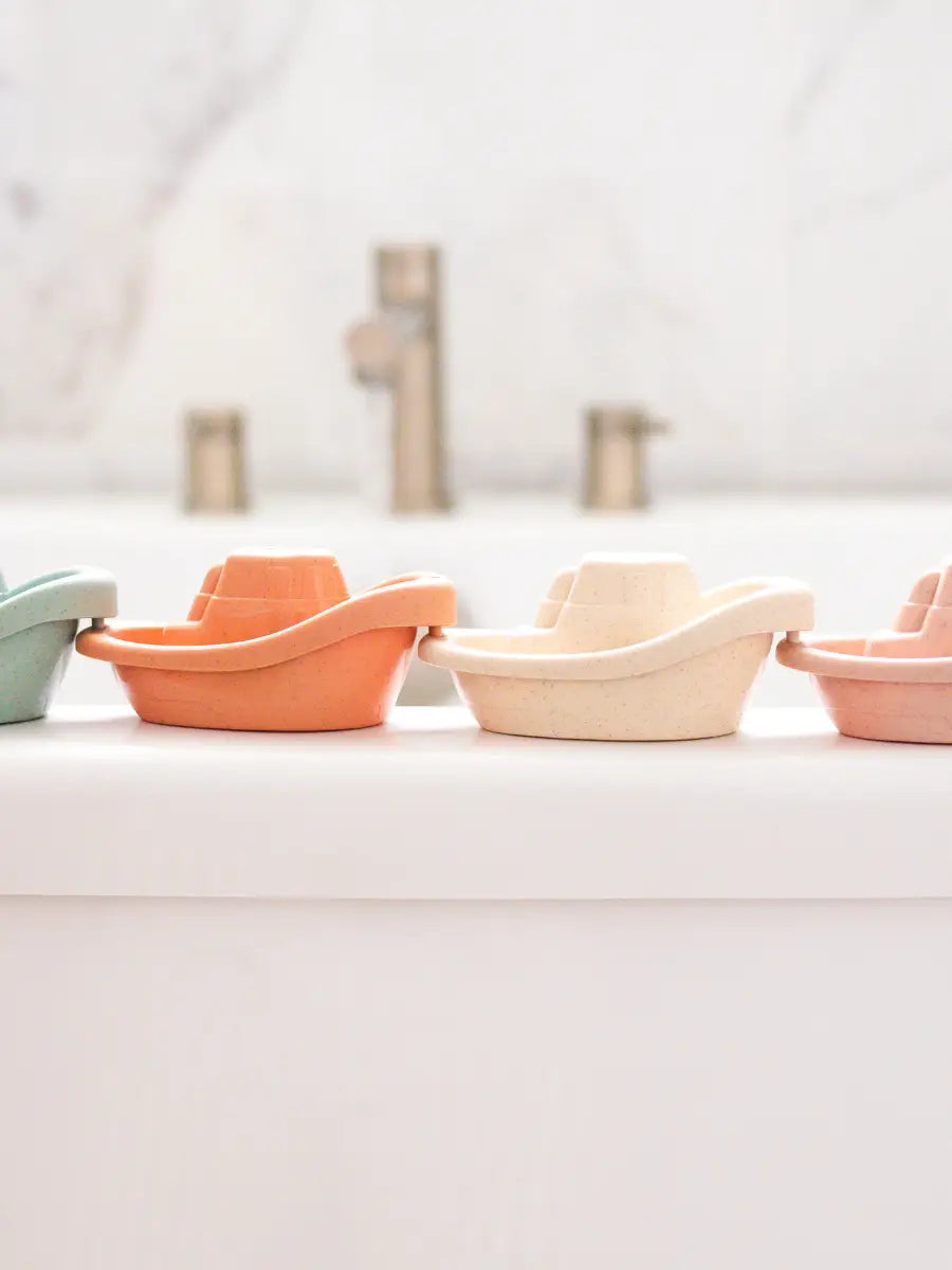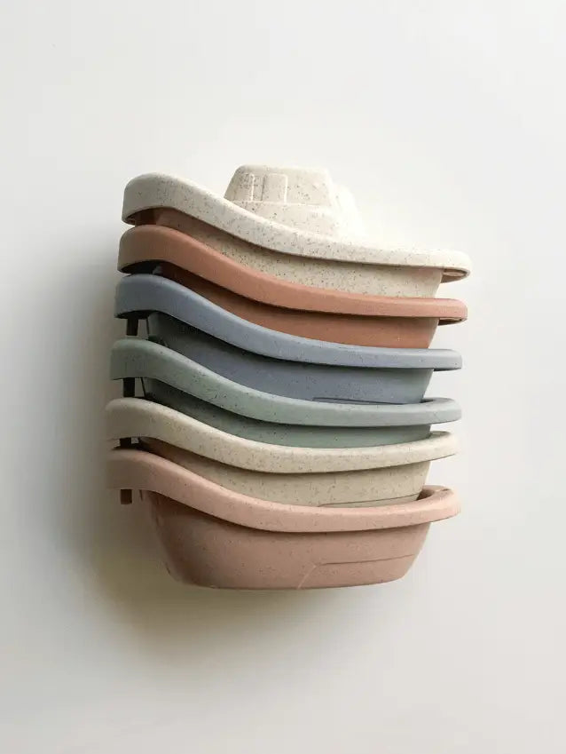 These gorgeous and sustainable floating boats can be stacked or linked for endless fun! They are made from wheat straw composite meaning they are biodegradable and sustainable while being lightweight and water safe. We love them in the bath, pool, or playroom! Ages: 6 months+ Dimensions: Approximately 12cm x 6.5cm Packaged in our signature reusable cotton drawstring bag. Wheat straw composite with non-toxic binder; BPA-free, Lead-free Clean with mild soap and dry in a cool spot