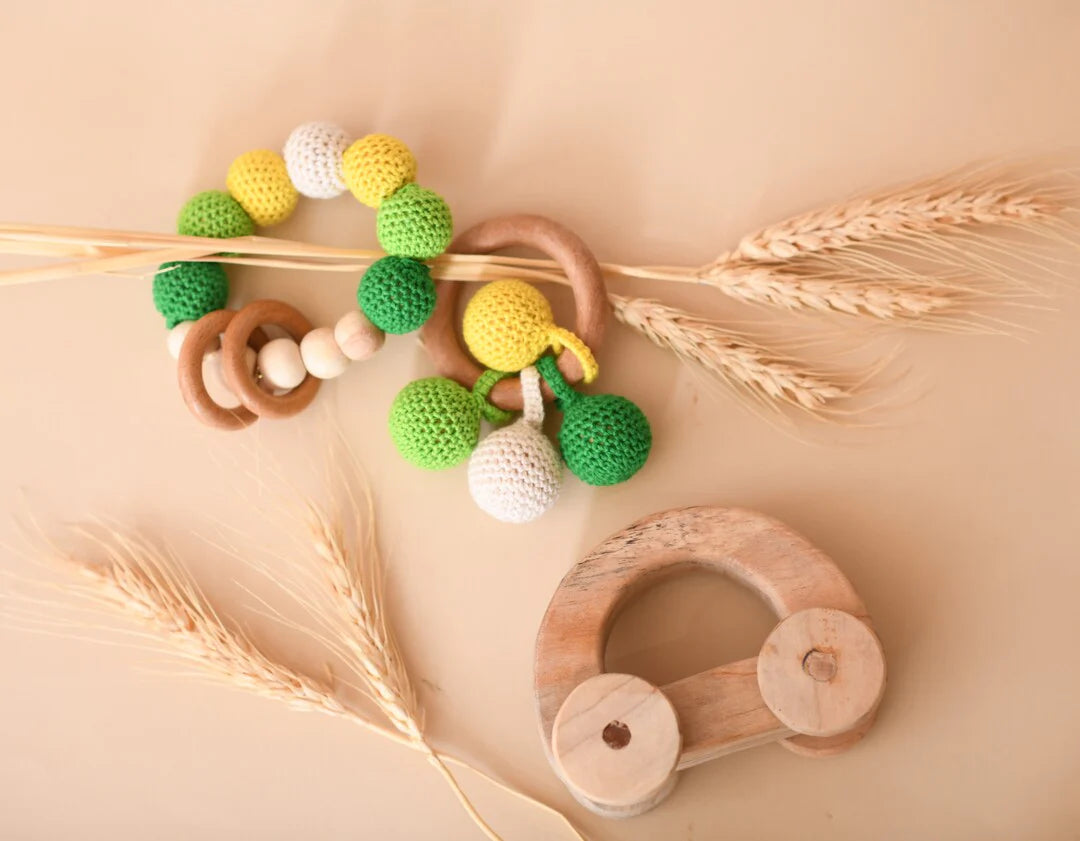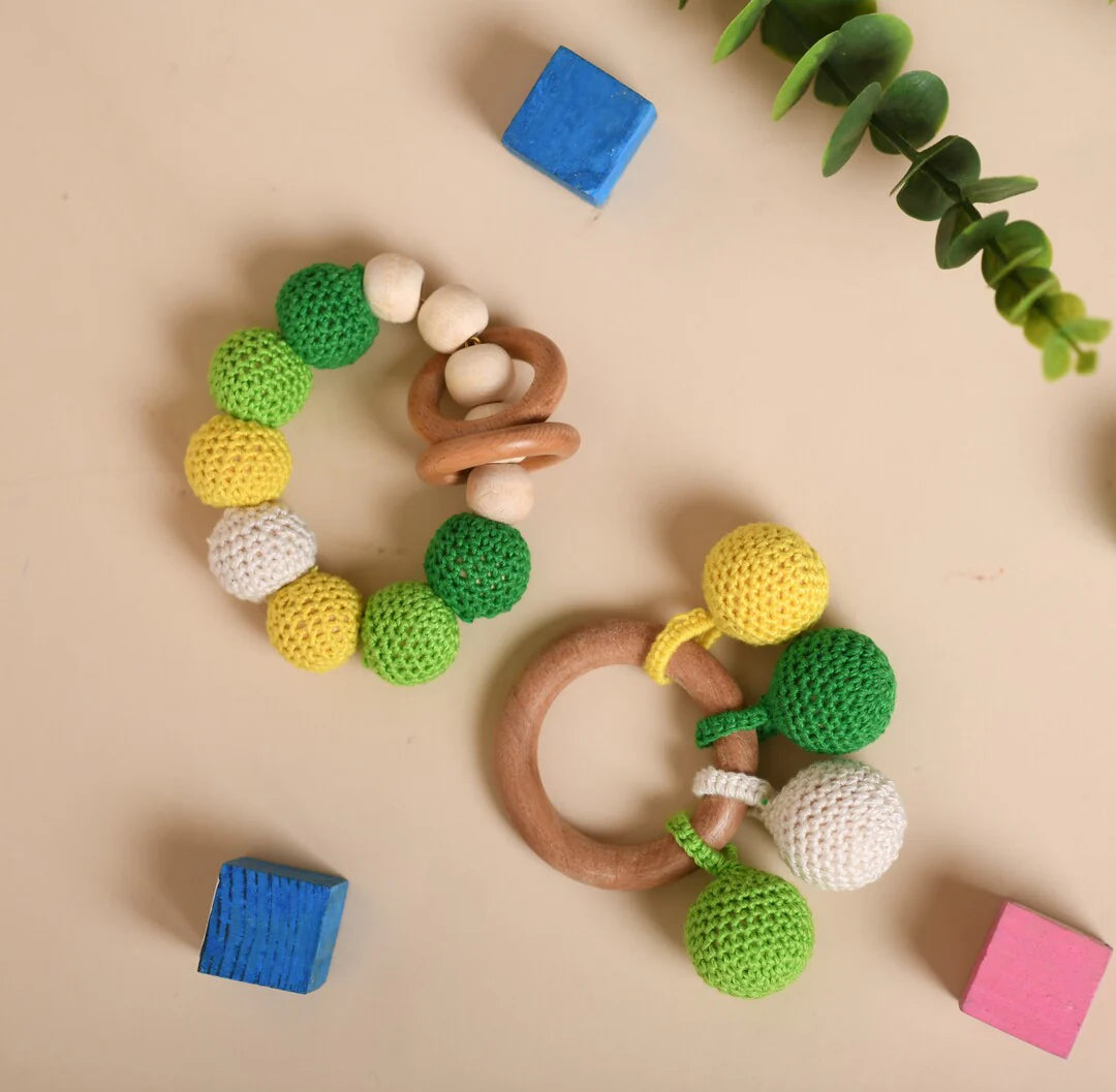 This 3 piece handmade set made by artisans features crochet beads, designed to grab your baby's attention. With attention to details, this delightful teether and rattle offers a perfect combination of functionality, safety, and aesthetic appeal. This is a great toy for your loved one or a great gift.