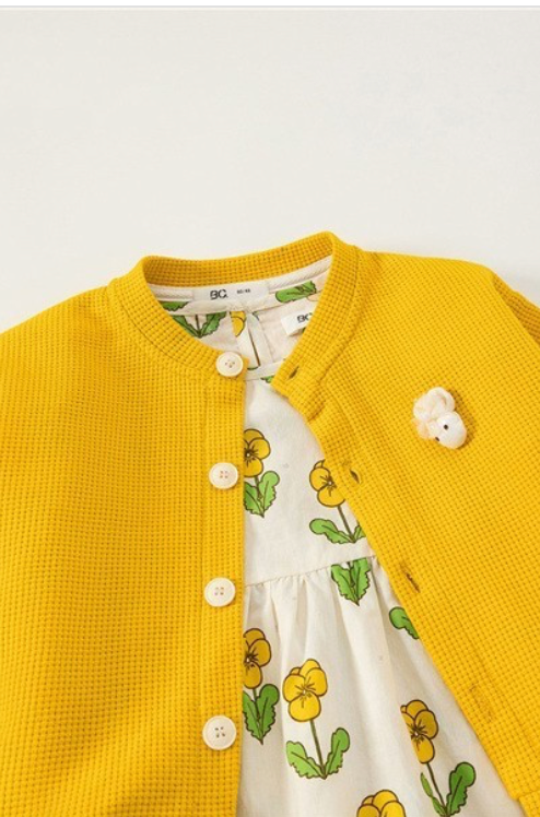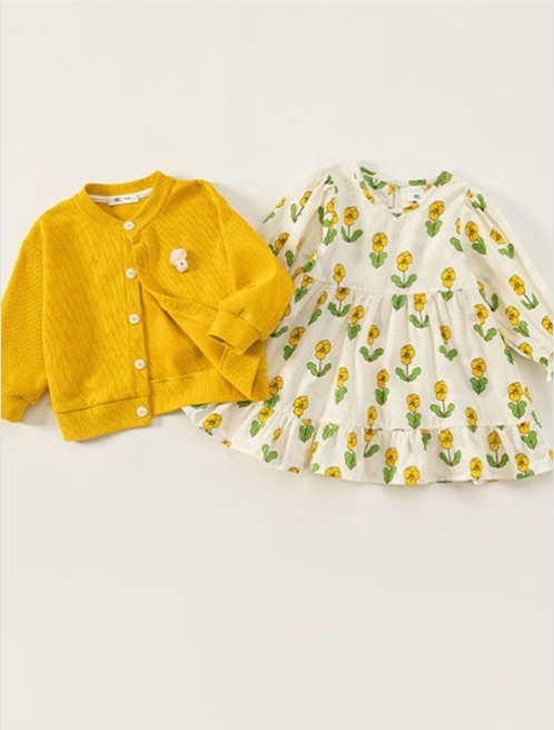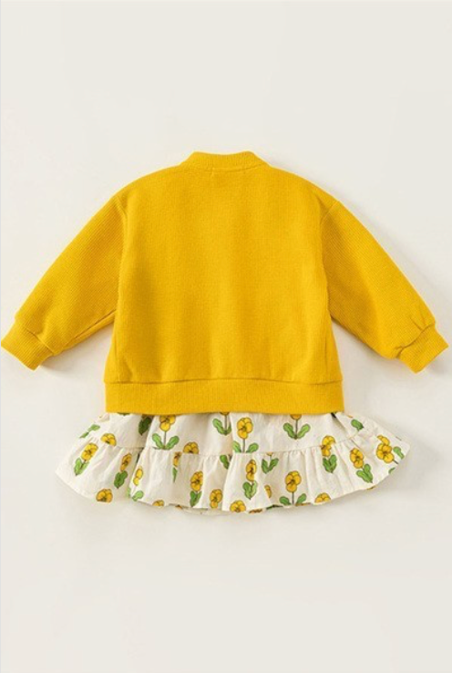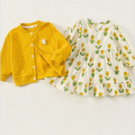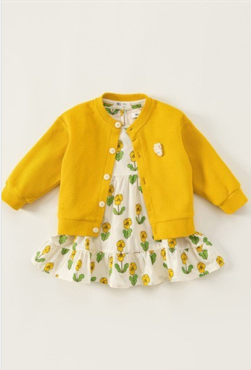 This outfit is not just about fashion; it's a burst of sunshine in a wardrobe, reflecting the bright and cheerful nature of childhood. The color coordination and playful patterns make it suitable for various occasions, from family gatherings to birthday parties. Your little one is sure to steal the spotlight while radiating positivity and charm in this delightful Yellow Flower Dress and Yellow Cardigan combo.